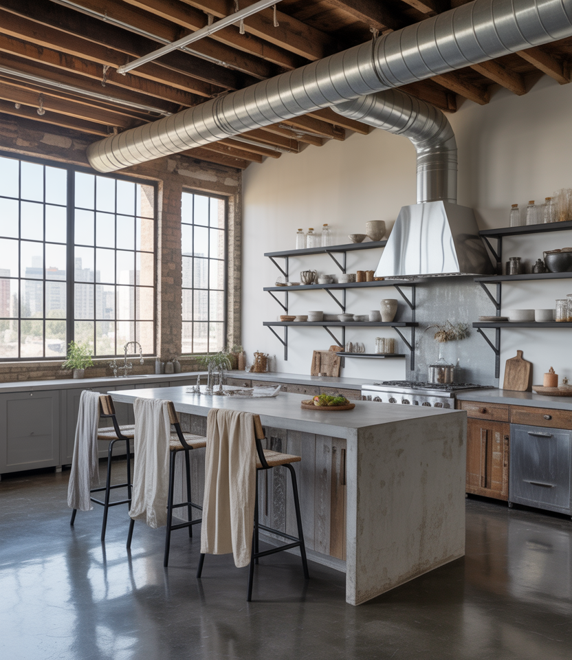 An industrial farmhouse kitchen leans into exposed ducts, metal stools, and concrete-style counters while keeping the bones rustic and welcoming. In 2026, this look often appears in renovated lofts and city condos where people want a little edge with their comfort. Picture reclaimed beams, steel shelving, and black-framed windows alongside soft linens and vintage cutting boards. The tension between rough and refined makes everyday cooking feel cinematic. It’s especially effective in high-ceiling spaces where industrial elements already exist and you’re simply softening them with farmhouse textures rather than fighting the architecture.