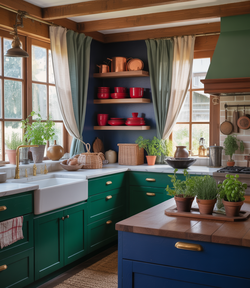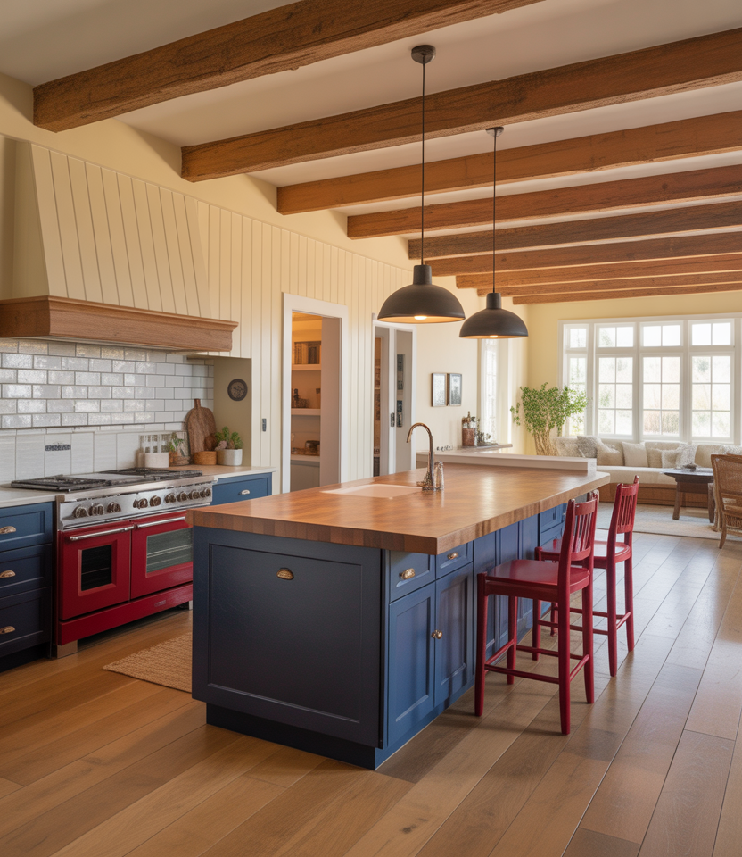 Color lovers are embracing confident combos like red and blue in the farmhouse kitchen for a distinctly contemporary twist in 2026. Instead of painting every cabinet, try a navy island with cherry stools or a deep red range framed by neutral tile. Balanced with warm woods and cream walls, the palette feels energetic but not circus-like. This idea works particularly well in open floor plans where the kitchen acts as a visual anchor. It’s a nod to Americana without slipping into theme-park territory, giving you a lively hub for game nights, cooking marathons, and casual entertaining.