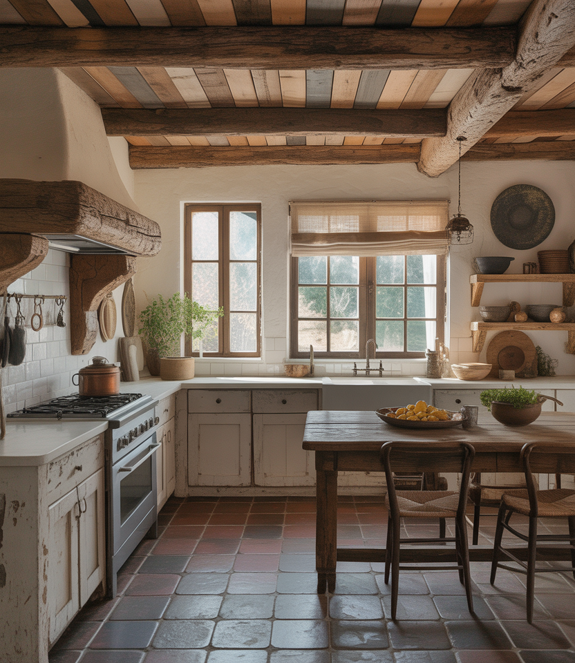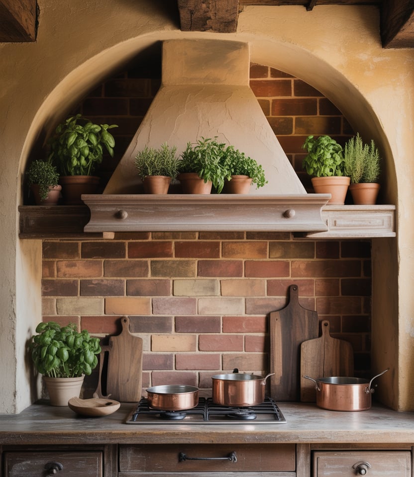 An Italian-inspired farmhouse kitchen with a brick hearth blends Mediterranean warmth with rural charm. In 2026, homeowners are incorporating arched alcoves, plaster hoods, and aged wood—balanced by a brick backsplash or terracotta floor. Soft green herbs in clay pots and iron details echo countryside trattorias. This idea works in both open layouts and small cottages, offering an old-world vibe that still feels functional. The space becomes a cozy gathering zone, where simmering sauces and lively conversation fill the air, creating the sense of a kitchen rooted in generations.
