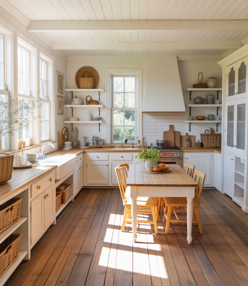 A light-filled country farmhouse kitchen becomes the social hub of the home in 2026, especially for busy families. Large windows, white or pale cabinetry, and plank floors create a bright base, while cozy banquettes and open display shelves invite lingering. Subtle rustic touches—like woven baskets, peg rails, and big farmhouse tables—keep the room grounded. The goal is easy circulation: kids grabbing snacks, neighbors stopping by, laptops on the island. This idea suits suburban homes and rural properties alike, turning the kitchen into a flexible, hardworking stage for everyday life rather than a showpiece used only on holidays.