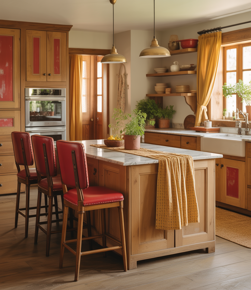 A red-accented farmhouse kitchen isn’t typical, which is precisely why it feels refreshing in 2026. Mixing warm red cabinetry details or barstools with rustic woods, soft yellow fabrics, or modern light fixtures helps counteract the heat of the palette. This direction works beautifully in family homes where the kitchen is always abuzz—its energy matches the pace of daily life. By keeping the red focused on a few key spots, you get personality without overwhelming the senses, creating a warm, memorable heart of the house.