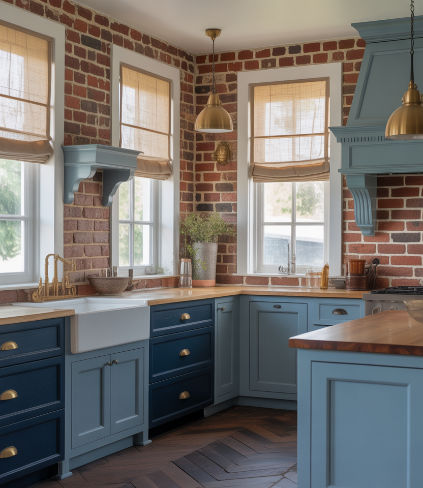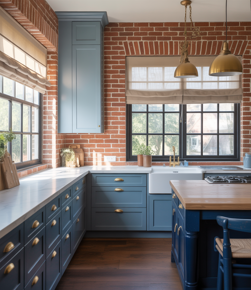 Combining a brick backsplash with layered blue tones strikes a perfect balance between tradition and freshness in 2026. The brick adds instant heritage, while blue—whether navy or powder—brings calm, European charm. This look works in renovated farmhouses where you want to respect original bones but still introduce color. Mix in black hardware, linen curtains, and aged brass for warmth. The contrast between brick’s rugged texture and blue’s softness keeps the kitchen textural without feeling heavy, ideal for homeowners who appreciate a story-rich space with a gentle contemporary edge.