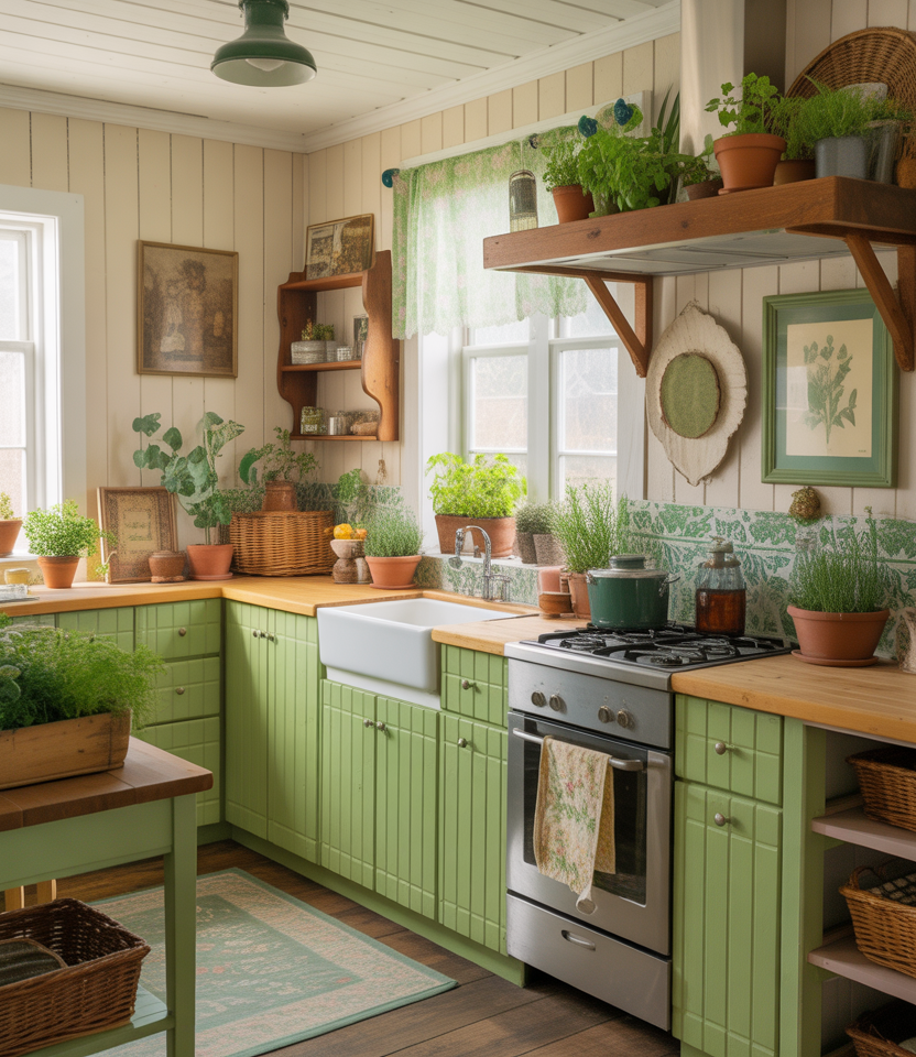 For garden lovers, bringing the outdoors in through green, yellow, and floral details creates a cottage-garden farmhouse mood. In 2026, this style blends vintage botanical prints, potted herbs, and soft painted cabinets. It’s especially fitting for sun-filled spaces or kitchens opening to a patio. Pair light woods with embroidered linens and a touch of white for balance. The idea isn’t kitsch—it’s about channeling that quiet joy you feel when you step into a greenhouse. A few well-chosen patterns and fresh greenery turn a simple kitchen into a cheerful, living extension of the garden itself.