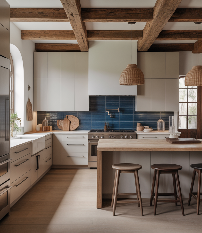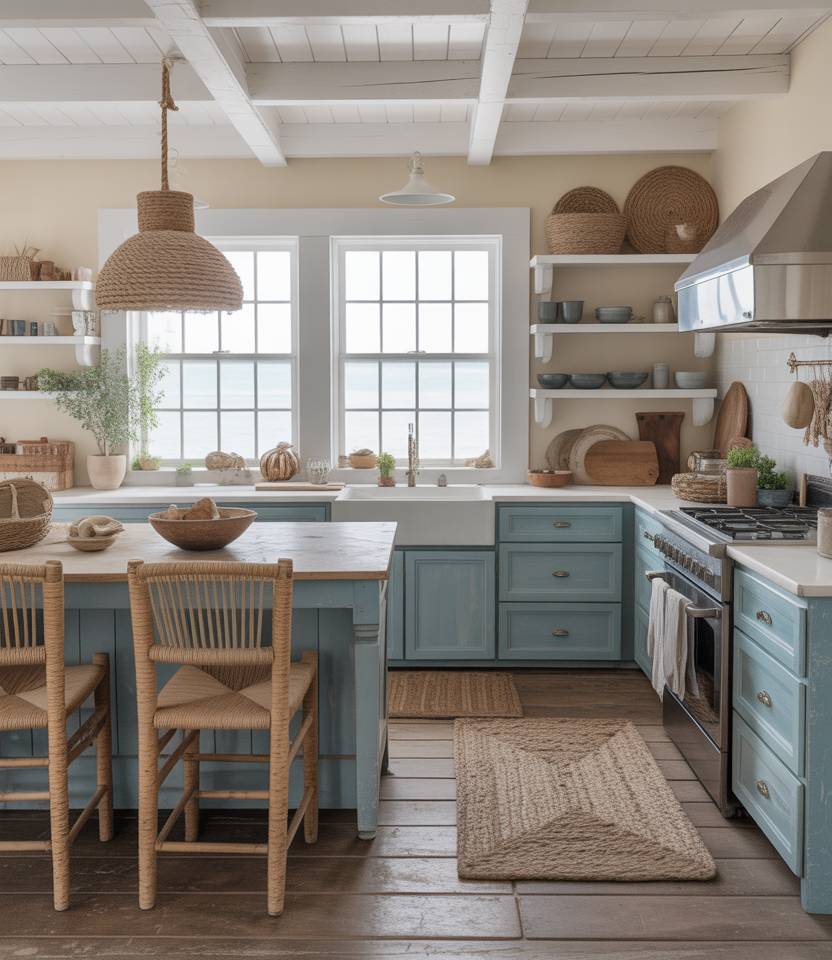 A coastal farmhouse trend introduces sandy hues, rope details, and weathered blues. It’s an easy translation for American coastal towns but works inland too if you want a breezy, vacation-like kitchen. Designers at Southern Living often highlight serenity as the goal—not overt beach décor—just relaxed natural textures paired with simple cabinetry.