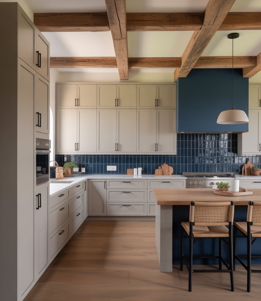 A contemporary farmhouse kitchen in 2026 pares design down to essentials without losing warmth. Flat-front cabinets, black fixtures, and slim open shelving sit comfortably beside rustic beams or a simple wood island. This design is ideal for homeowners who want a clutter-free space but still crave natural materials. Neutral palettes—white, sand, and oat—keep the room breezy, while one bold accent like deep moody paint or blue tile adds depth. The result feels calm, efficient, and timeless, proving that minimalism can still have soul when you mix modern lines with tactile textures.