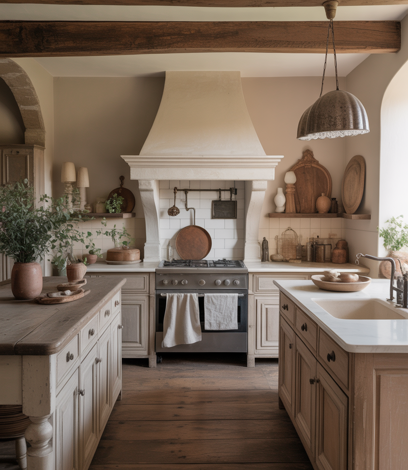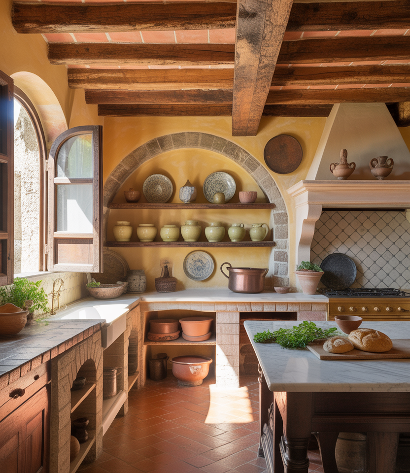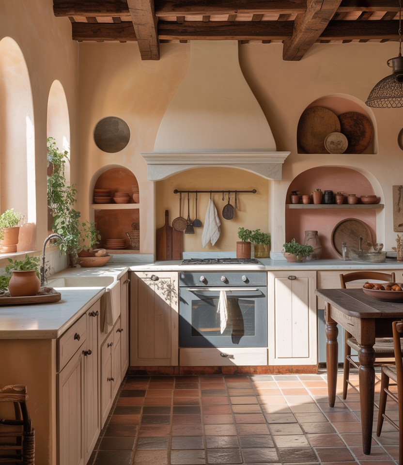 An Italian, rustic-meets-elegant direction is gaining traction for 2026, echoing the European farmhouse kitchens admired in travel magazines. Terracotta tones, arched niches, and worn wood create warmth, while open shelving keeps the look approachable. Whether in a ranch house or townhouse, the atmosphere feels sun-washed and deeply familiar.