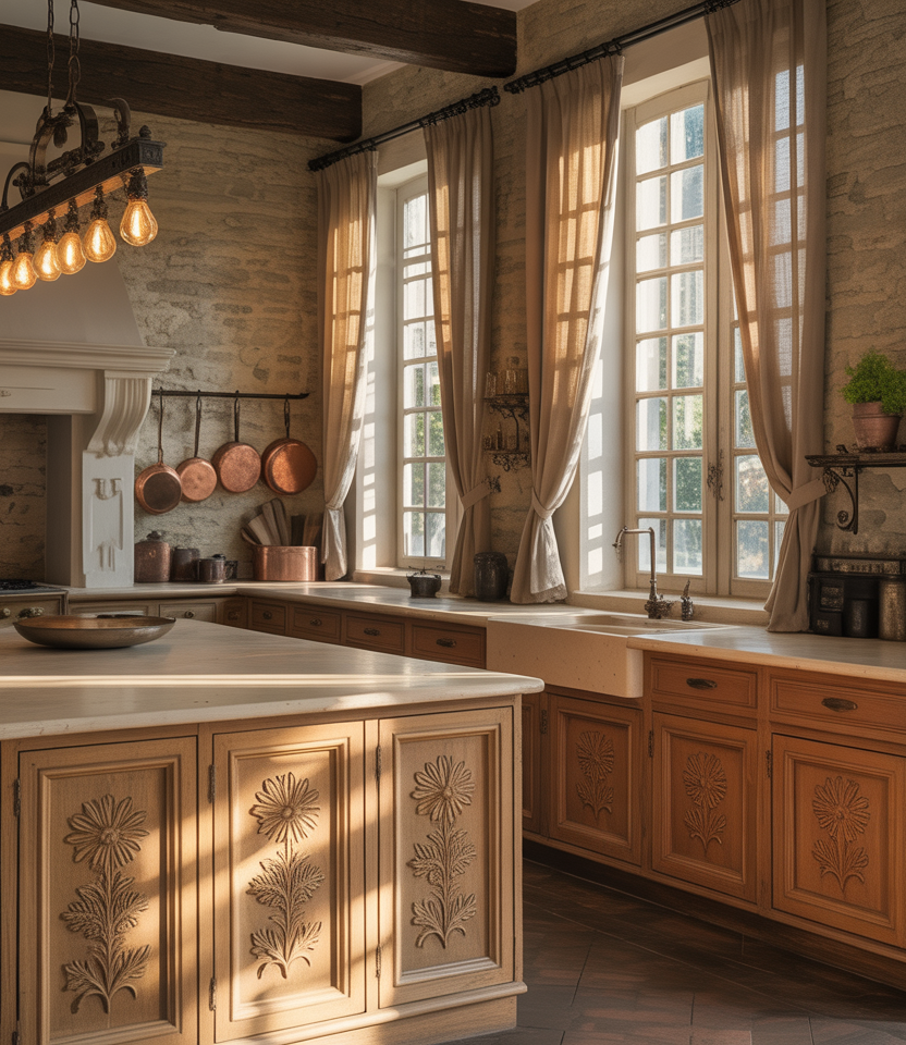 Soft curves, carved wood, and gentle color palettes define the French farmhouse kitchen for 2026. This look leans romantic without feeling fussy, thanks to subdued finishes and linen textures. It’s perfect for homeowners drawn to subtle artistry—think carved legs on islands or muted stone. The mood is refined, collected, and undeniably welcoming.