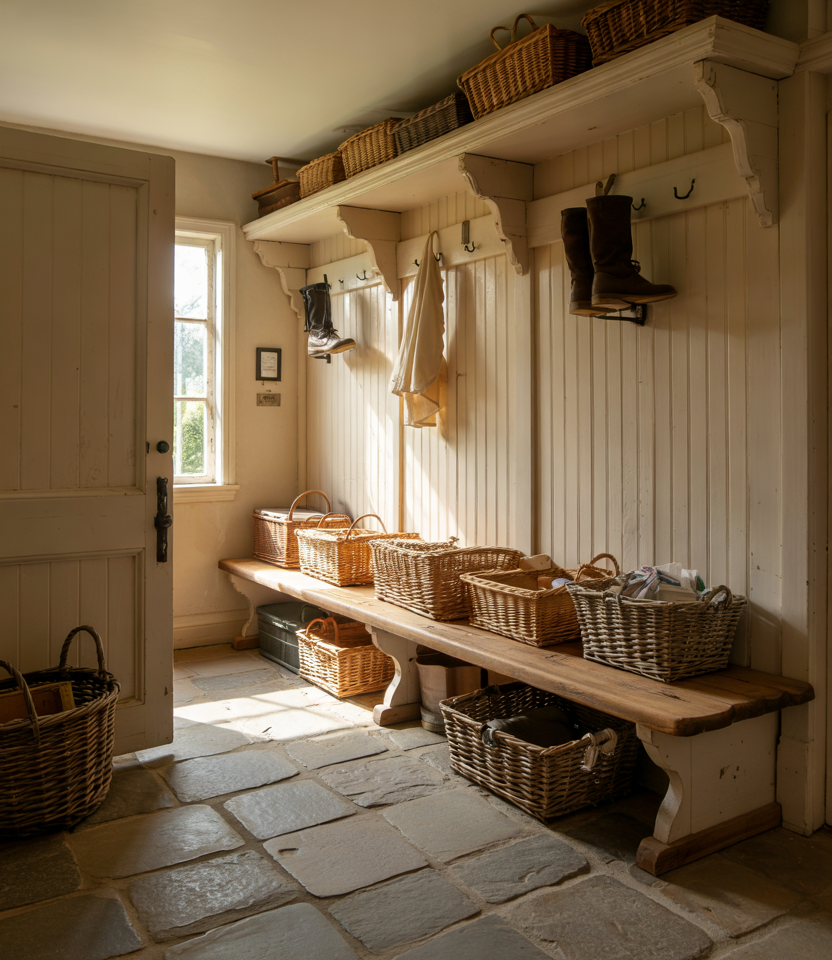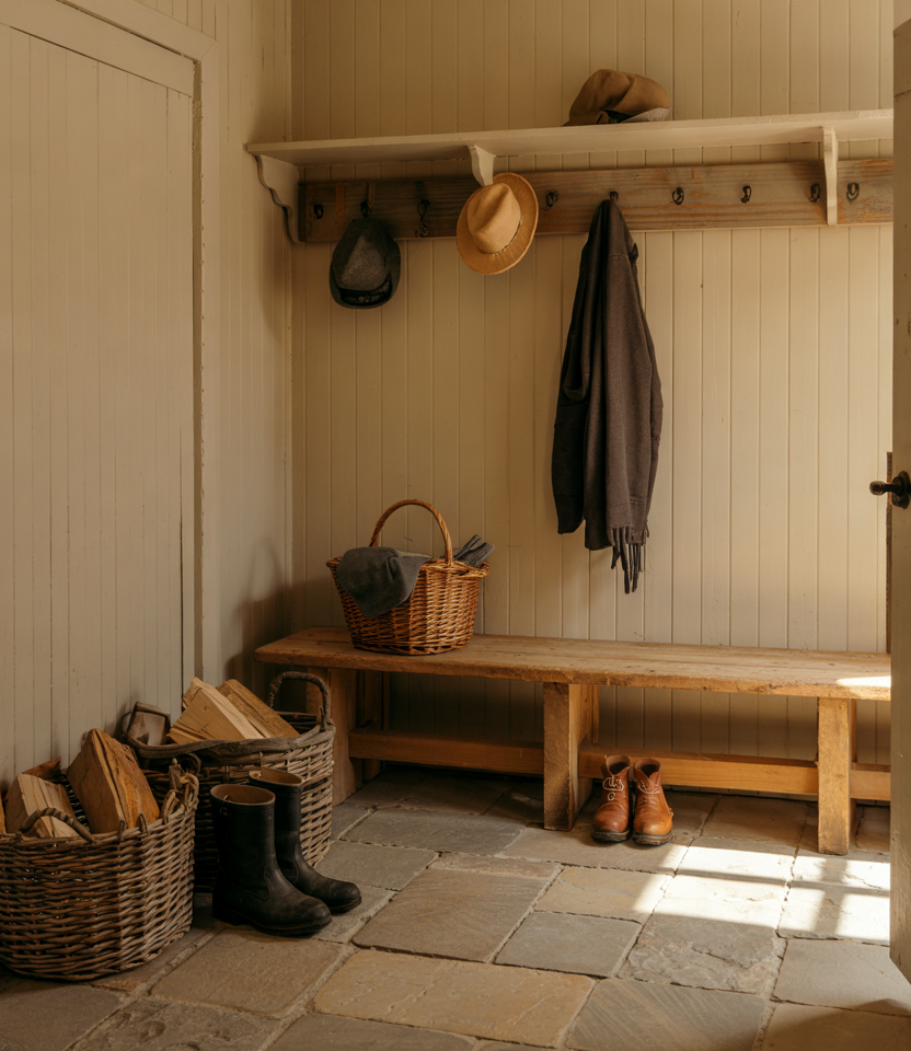 A French country mudroom thrives on natural materials and quiet charm. Try stone tile paired with simple storage crates and a washed bench. Add a hint of ideas from farmhouse-style master bedrooms’ softness or the earthy spirit of rustic finishes to keep it grounded. The mix feels warm, durable, and effortlessly European.