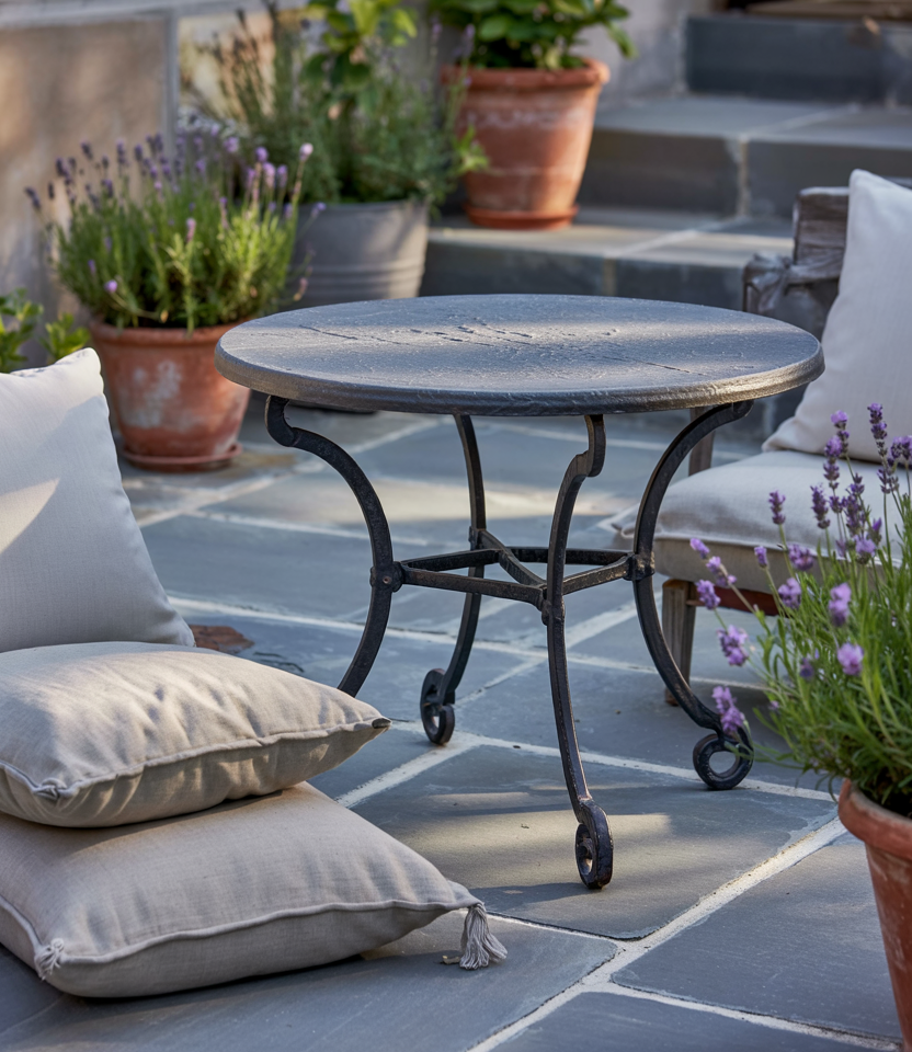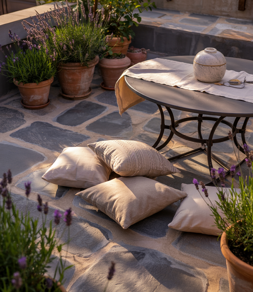 A patio inspired by Provence blends outdoor dining with relaxed elegance. Bluestone pavers, linen cushions, and iron lanterns introduce texture. Add small nods to blue pottery or living room farmhouse-style comfort for continuity. The result feels serene, social, and ready for long alfresco evenings.