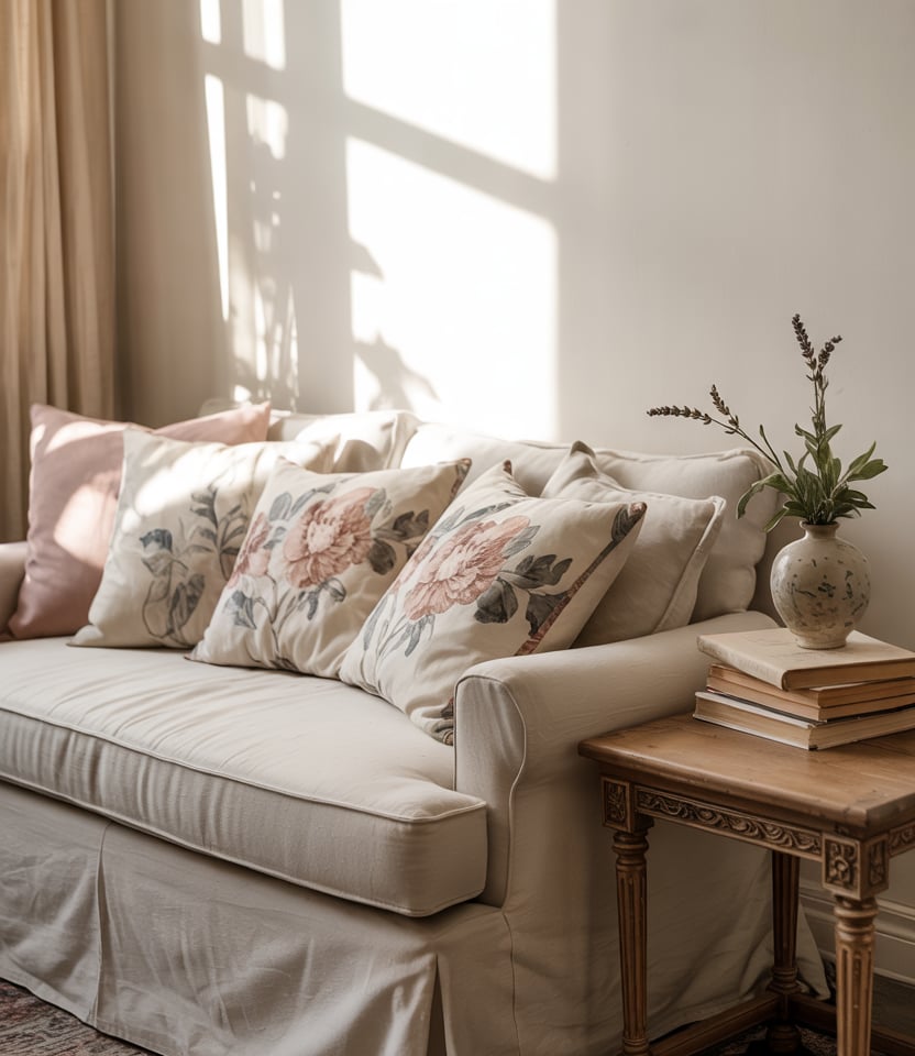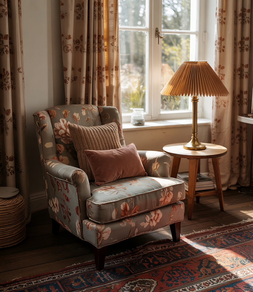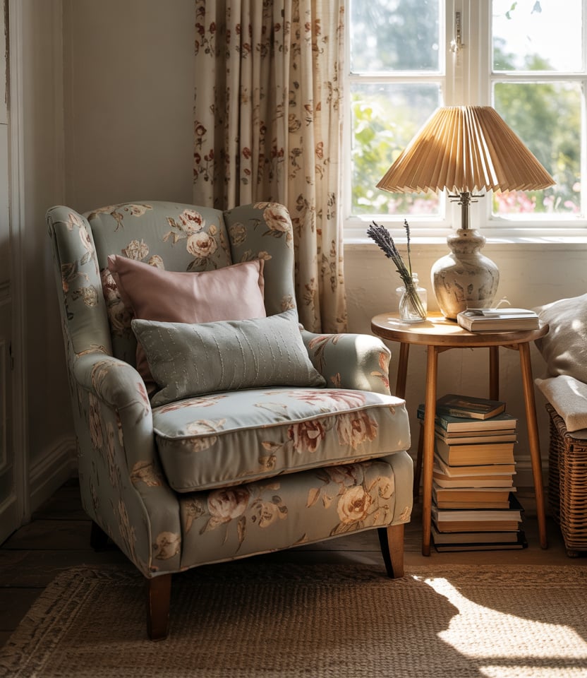 Blending French country with a gentle living room in English cottage style creates a layered, worldly charm. Incorporate embroidered pillows, pleated lampshades, and warm woods. Even a hint of elegant detailing keeps the look elevated. Think intimate, story-filled corners.