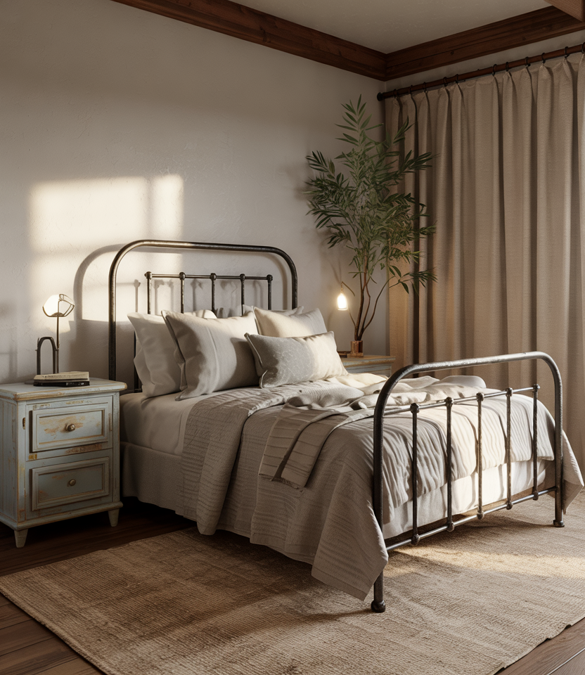 A wrought-iron bed anchors a charming French country guest room. Soft quilts and gentle neutrals make it instantly welcoming. Add touches reminiscent of bedroom farmhouse-style shabby chic linens or a hint of colorful embroidery for personality. The room feels collected, not staged.