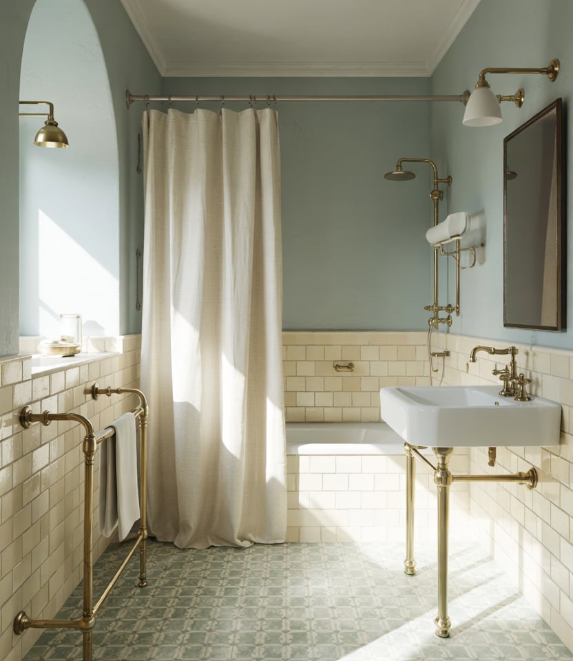 Soft blue French walls paired with brass hardware create a refined cottage bath. Wooden stools, linen curtains, and patterned tiles add charm. Small touches inspired by bathroom styling or a dash of blue in accessories keep it cohesive. The palette feels refreshed yet classic.