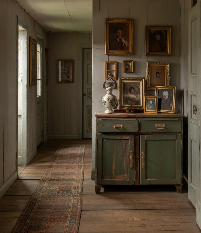 A narrow hallway becomes a character-filled moment with an antique cabinet. Patinated wood, old brass pulls, and layered frames create depth. Add gentle cues from rustic French décor or the airy feel of living room farmhouse-style shabby chic textiles. It’s small but impactful.