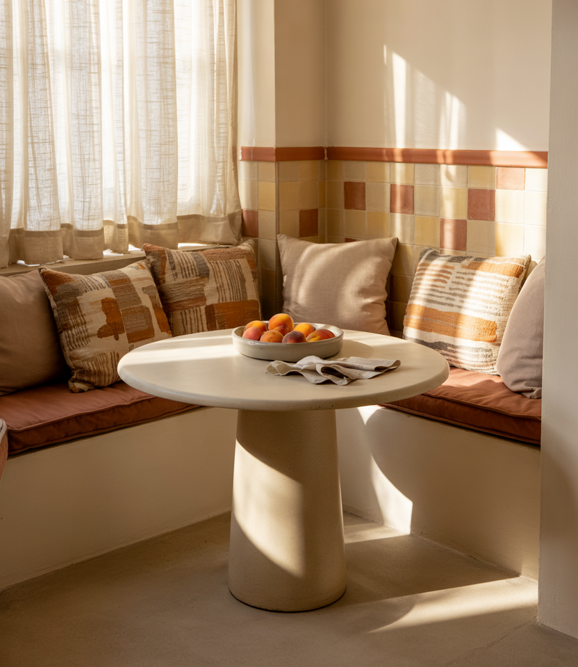 A cozy corner nook brings the heart of Provence into everyday life, mixing linen cushions with aged finishes. Add subtle hints of blue ceramics or kitchen farmhouse-style dining room textures to keep it classic. Soft curves and natural fabrics make the nook feel both relaxed and timeless.