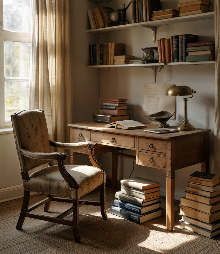 A small study corner comes alive with French country charm through linen drapes, soft woods, and muted hues. Add subtle hints of ideas you’ve saved for cottage inspiration, or pair gentle notes of dark bronze hardware with warm textures. Even a touch of English influence keeps the space refined yet relaxed.