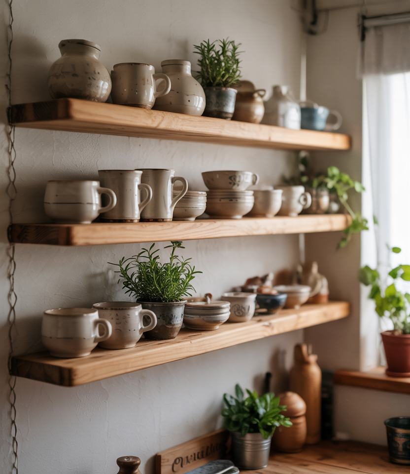 Open shelving brings a bright, accessible feel to a French country kitchen. Display pottery, baskets, and soft ceramics to add warmth. A sprinkle of colorful accents or a nod to kitchen design ideas for modern updates keeps the look fresh. Layer in a few rustic touches for timeless charm.