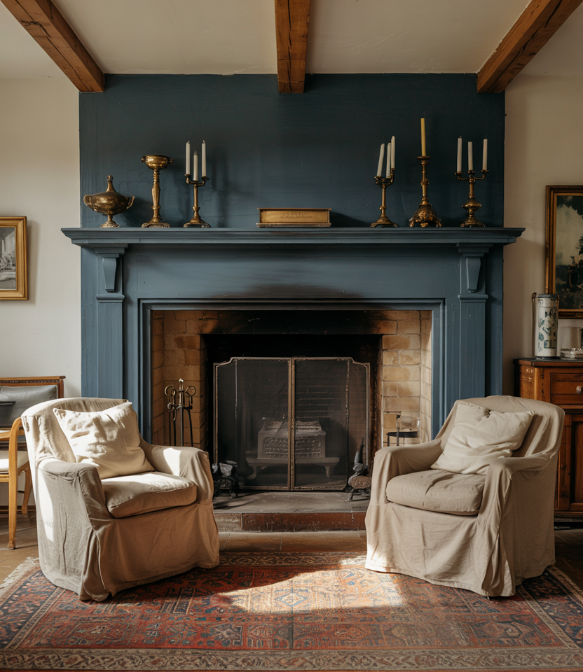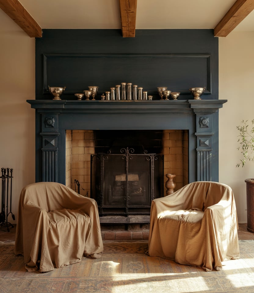 Painting a fireplace surround in moody tones can give French country décor unexpected depth. Shades inspired by dark slate or a muted blue bring contrast without overwhelming the room. Add woven accents and soft florals to keep the space grounded in rustic tradition.