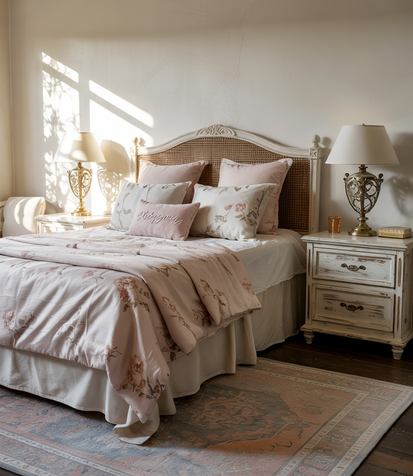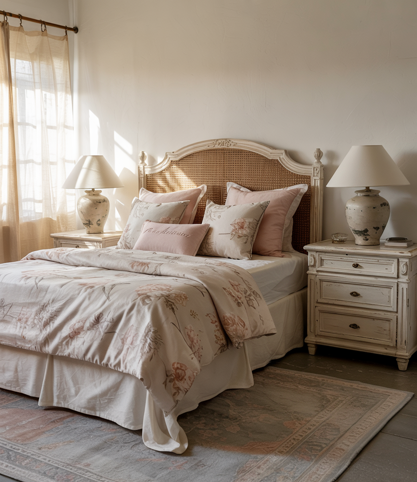 This idea leans into weathered finishes and layered fabrics, perfect for those who love bedroom farmhouse-style shabby chic touches. A muted palette with faded roses and chipped-paint furniture sets a dreamy tone. Small antique frames or pastel textiles balance the look beautifully.