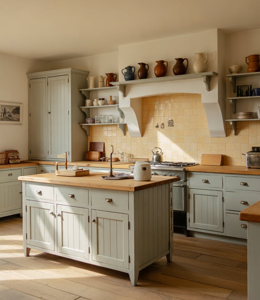A pantry painted in muted green instantly channels old-world charm. Add wicker baskets, flour jars, and vintage teacups for warmth. Light touches inspired by English cabinetry or ideas for the cottage palette give it French country authenticity. It’s a compact space with a big personality.