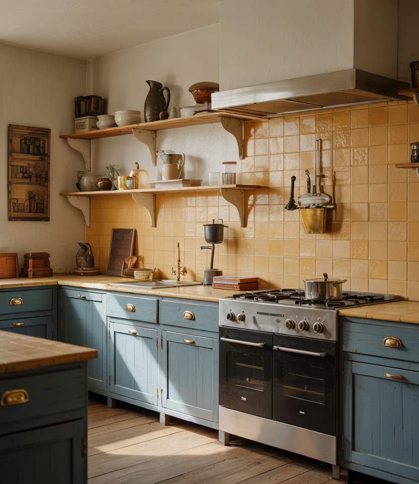 Nothing says French country more than a cheerful kitchen blending blue and yellow tones with aged wood. Add slightly worn tiles, iron hardware, or kitchen design ideas for modern storage details to keep it current. It creates a warm European farmhouse mood without losing functionality.