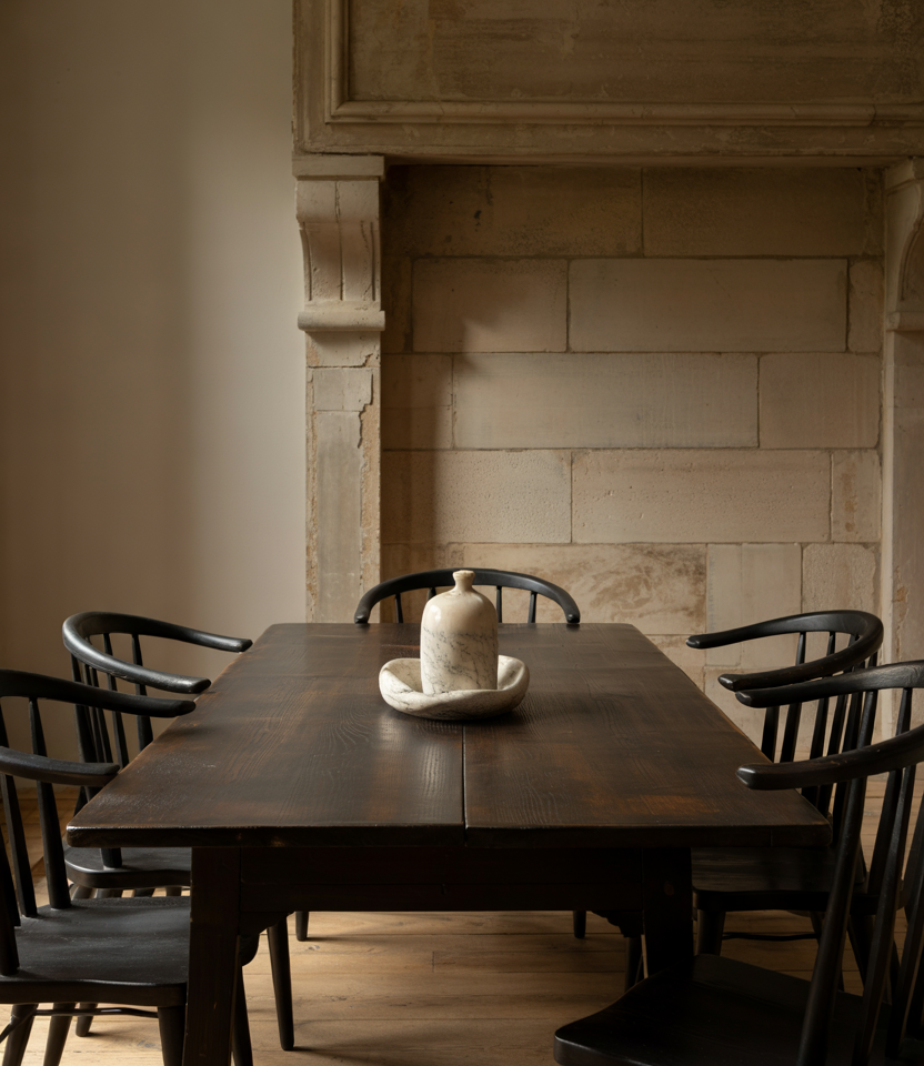 Darker palettes bring modern drama to French country spaces. Introducing moody tones or a touch of black in chairs or cabinetry adds contrast while keeping the farmhouse feel intact. Candlelight, soft linens, and rustic beams pull the look together effortlessly.