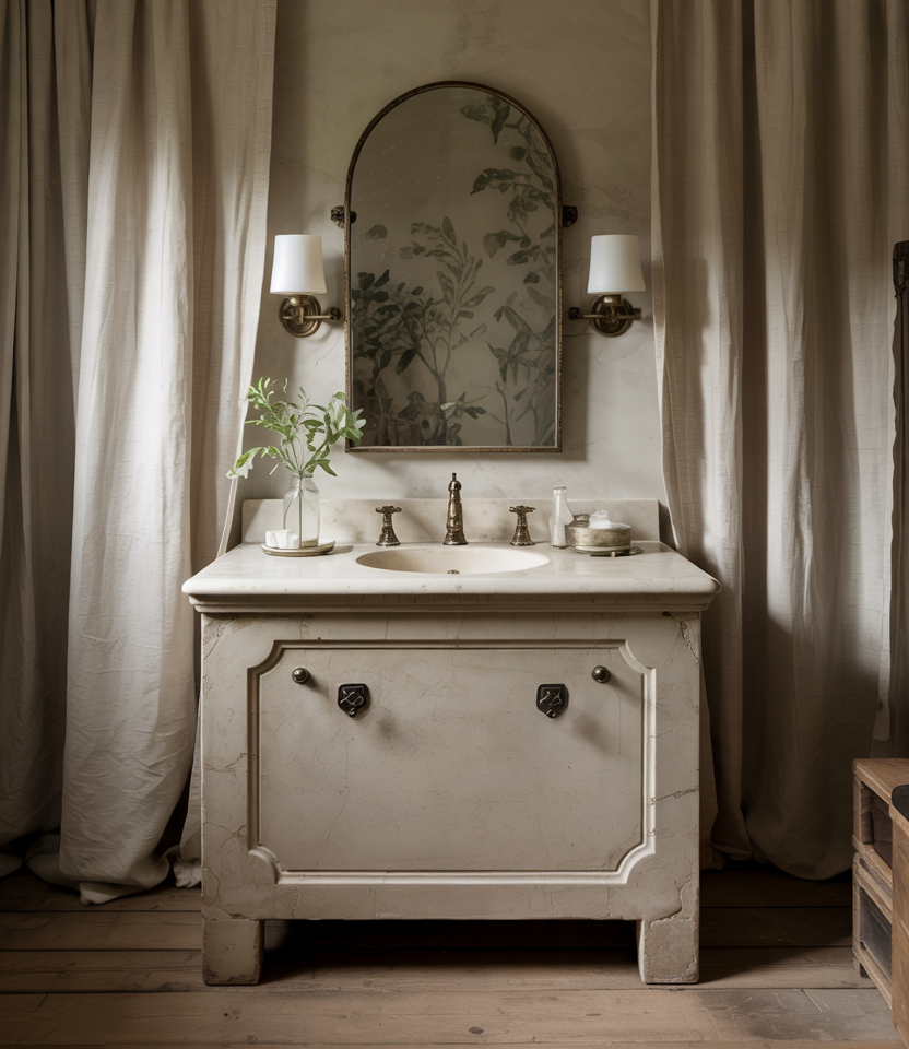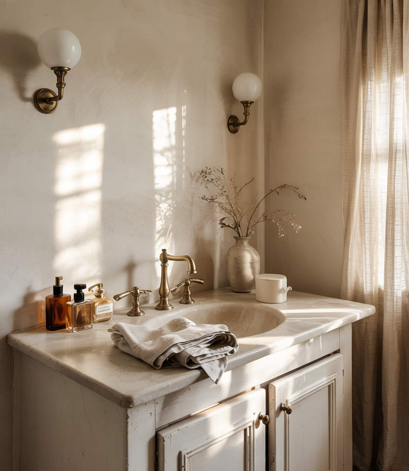 Bathrooms benefit greatly from French country charm, especially when softened with stone textures and muted palettes. Bring in a touch of bathroom farmhouse appeal, or try a small DIY upgrade like brushed brass hardware. Subtle earthy tones make the room feel relaxed and inviting.