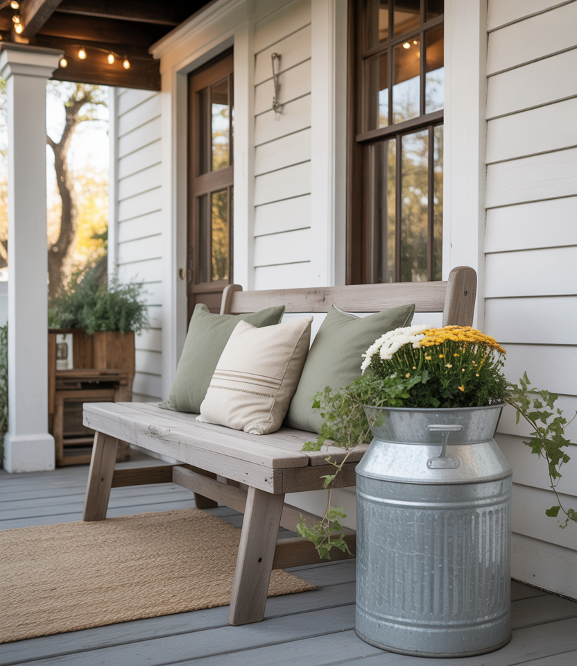 What your porch needs as a first step towards being fully designed as a transition point between indoors and outdoors includes a farmhouse bench under a columned porch that leans over it, with a milk can filled with seasonal flowers or plants, as well as perhaps a light to illuminate it at night. This farmhouse design appears best for older homes or homes with a farmhouse look in mind. It’ll turn your porch from a transition point to a place where everyone gathers.