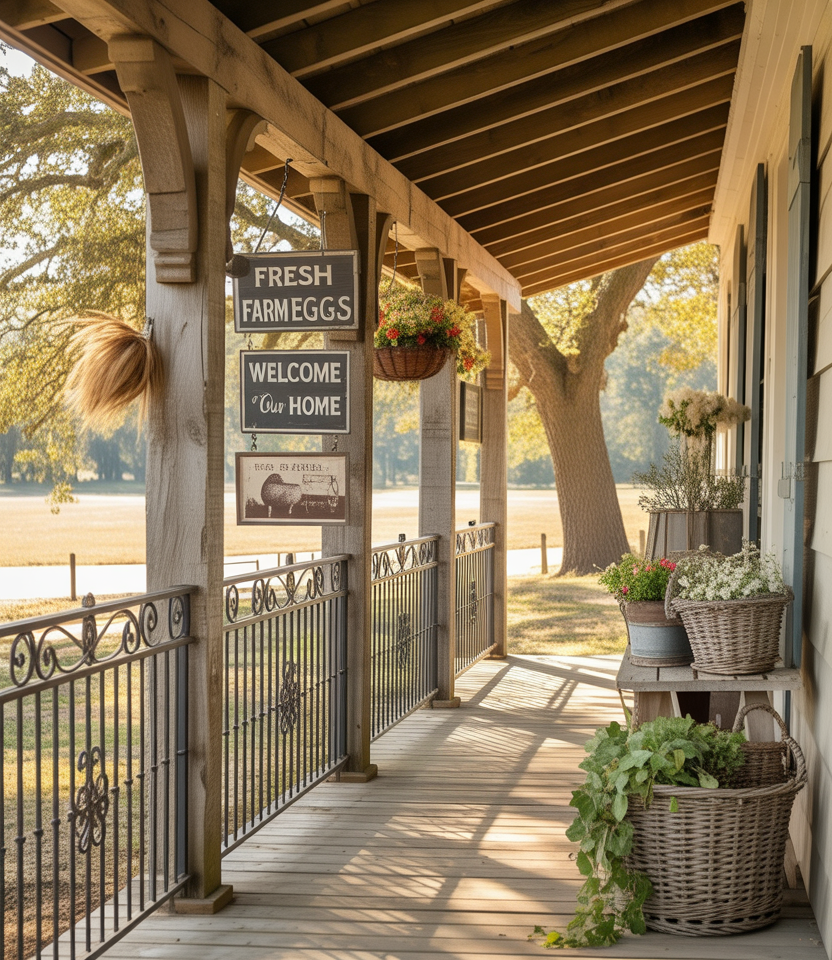 Add wooden or paint-treated column decorations that resemble farmhouse designs. Combine wooden or paint-treated column decorations with an iron porch railing painted white to create a pleasing contrast. Add a few baskets or a vintage sign for that extra feature. This simple porch design will perfectly connect your porch’s entrance to its rustic roots, yet it will look perfectly fresh.