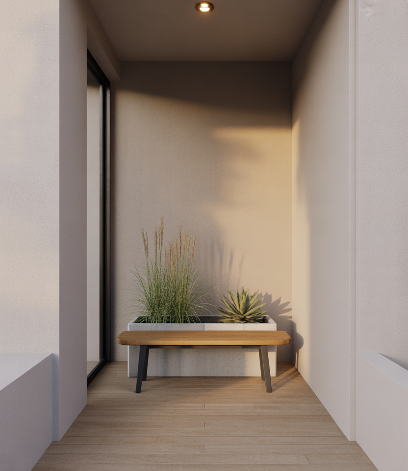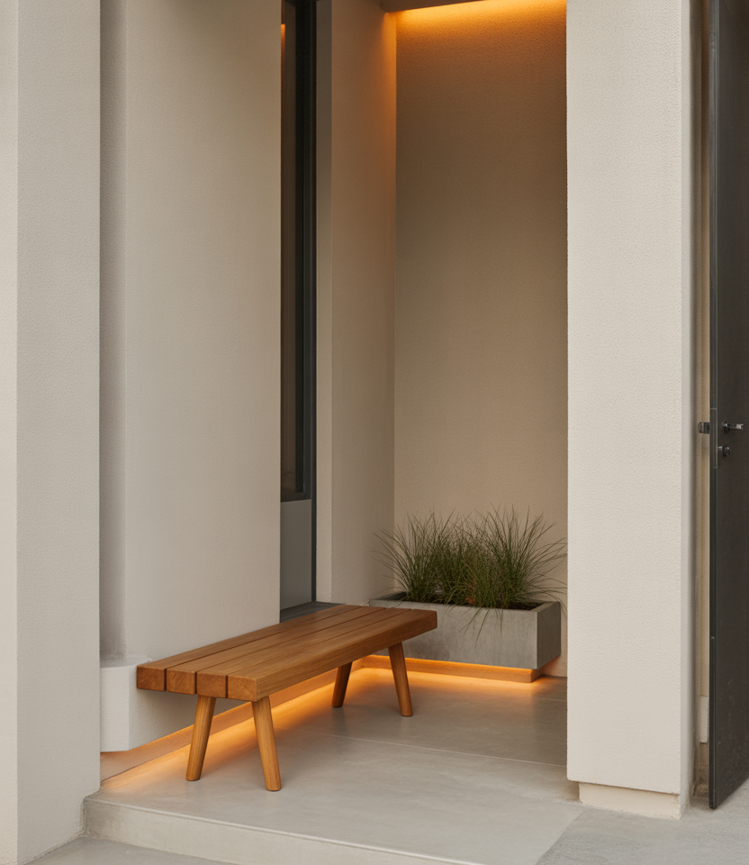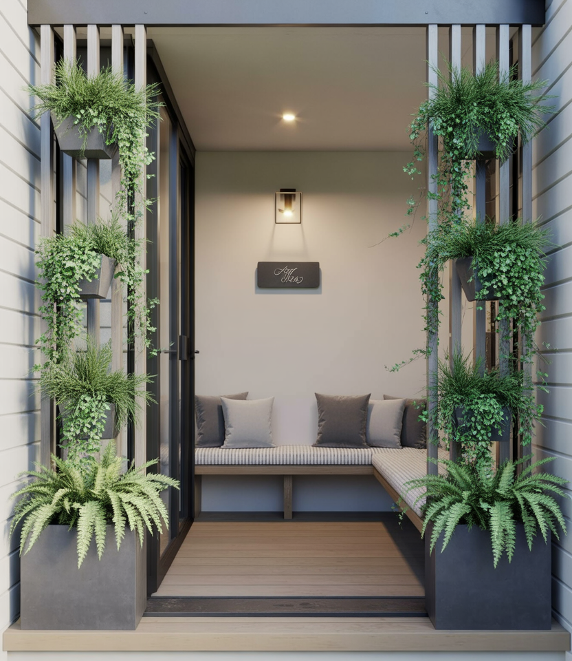 Minimalism works perfectly for narrow porch designs. Choose a minimalistic sofa, such as a bench or a folding one, with monochrome designs for your decor pieces. One stylish planter with a warm lighting ambiance will instantly transform your narrow porch entrance design into a sophisticated oasis in 2026. Minimalism will, in this case, perfectly translate to sophistication.