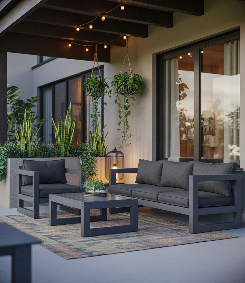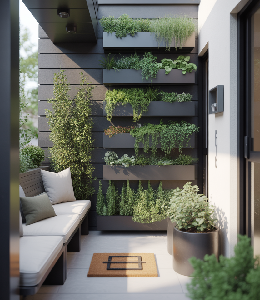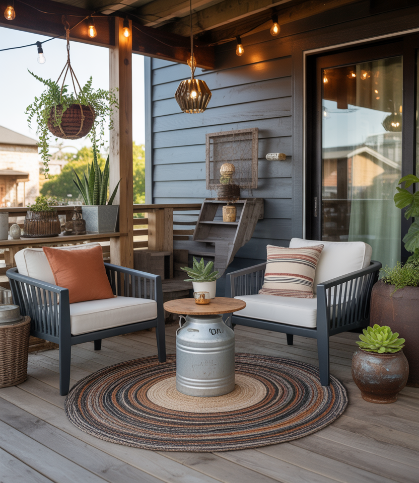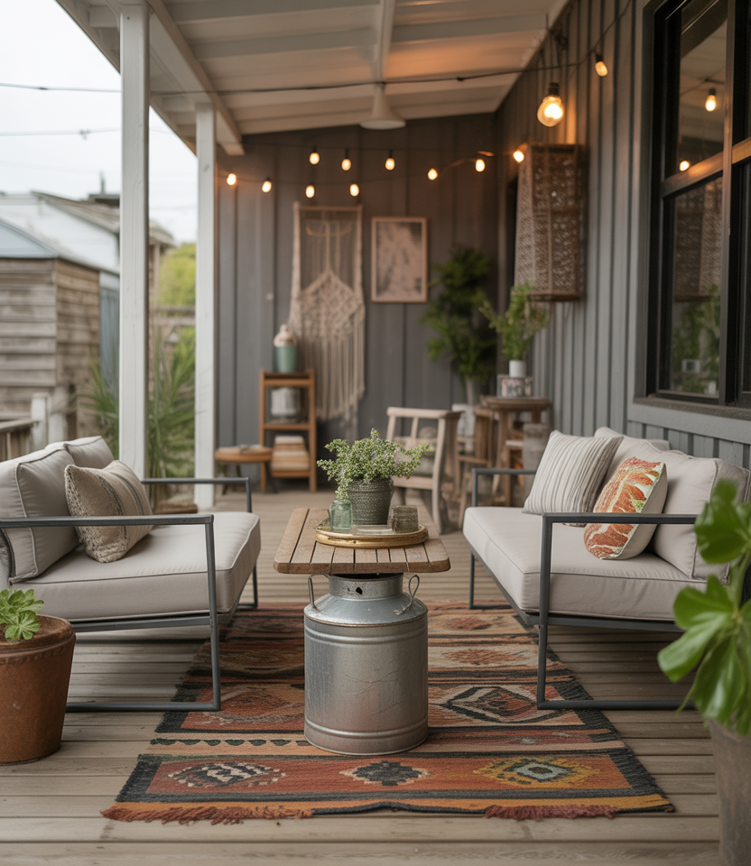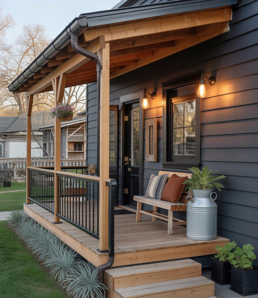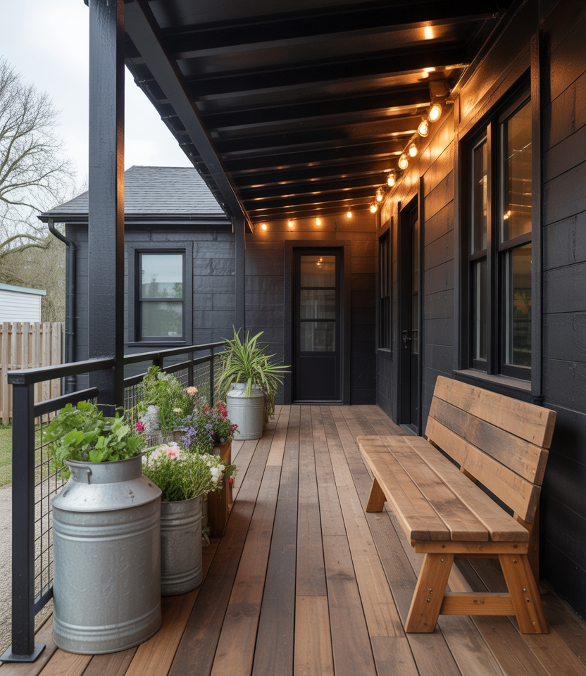 For 2026, many designers predict a rise in decor that fuses modern industry with natural warmth. Think black steel accents, reclaimed wood beams, and planters made from metal barrels or milk can bases. A simple bench and minimalist lighting complete this bold, urban-meets-rustic design.