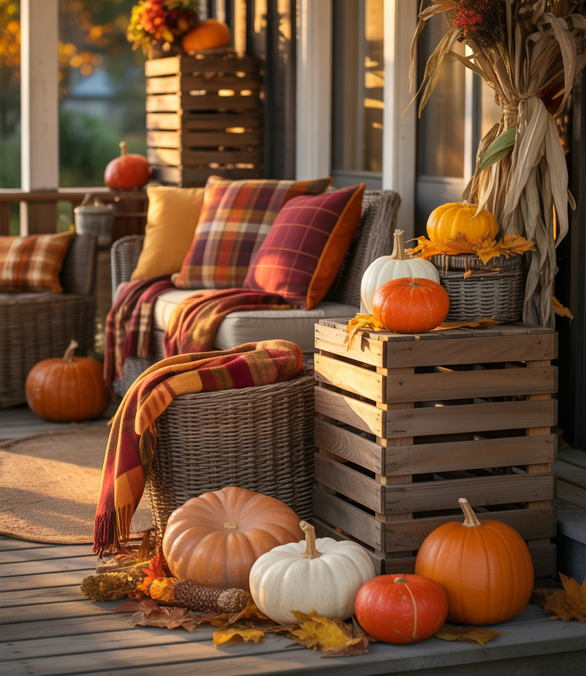 Create simple fall sophistication with textures, such as plaid toss pillows, wood crates, and autumn-themed wreaths. Add elements of decor, such as rustic pumpkins or dried corn stalks, for a pop of warmth. It’s easy: harmonious colors and pieces that prioritize function for a lived-in, warm look that avoids over-decorating.