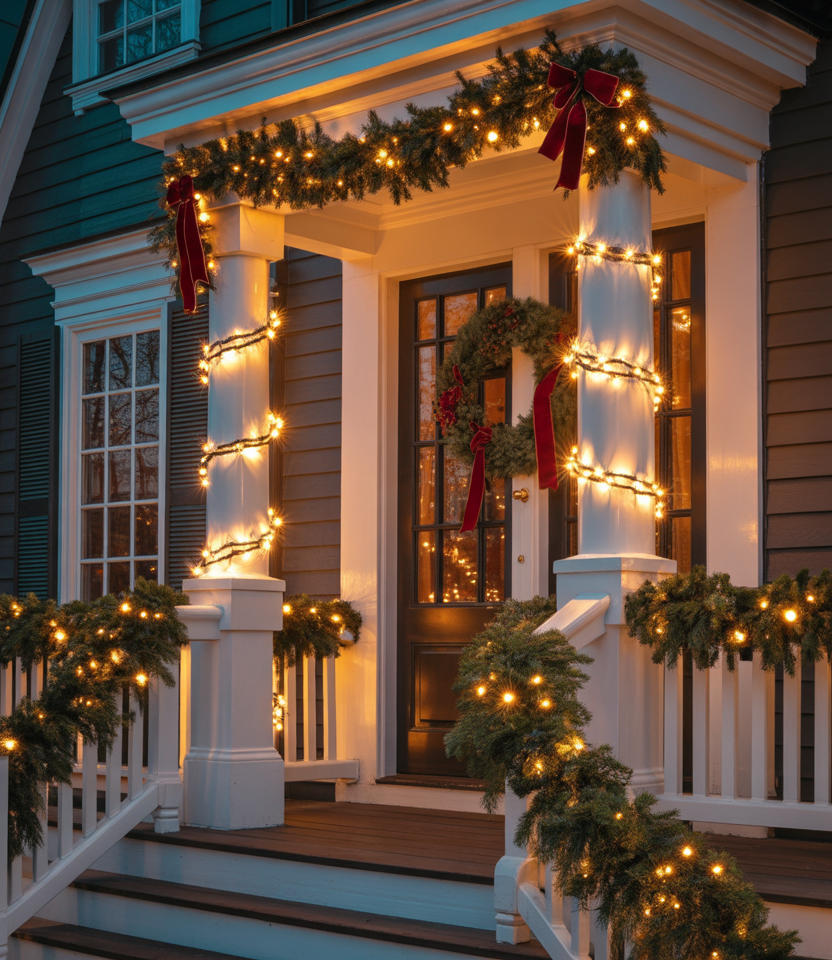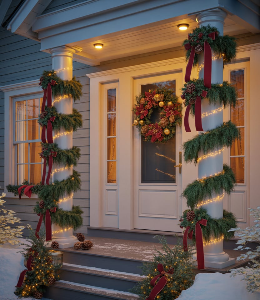 Welcome Christmas 2026 with a layered Christmas look, including greenery, a shining wreath, and table lamps around your column light bases. Create your Christmas porch glow beyond Christmas, too, with warm fairy lights for evening ambiance. Christmas decorating effortlessly integrates with home design with a simple, refined look.