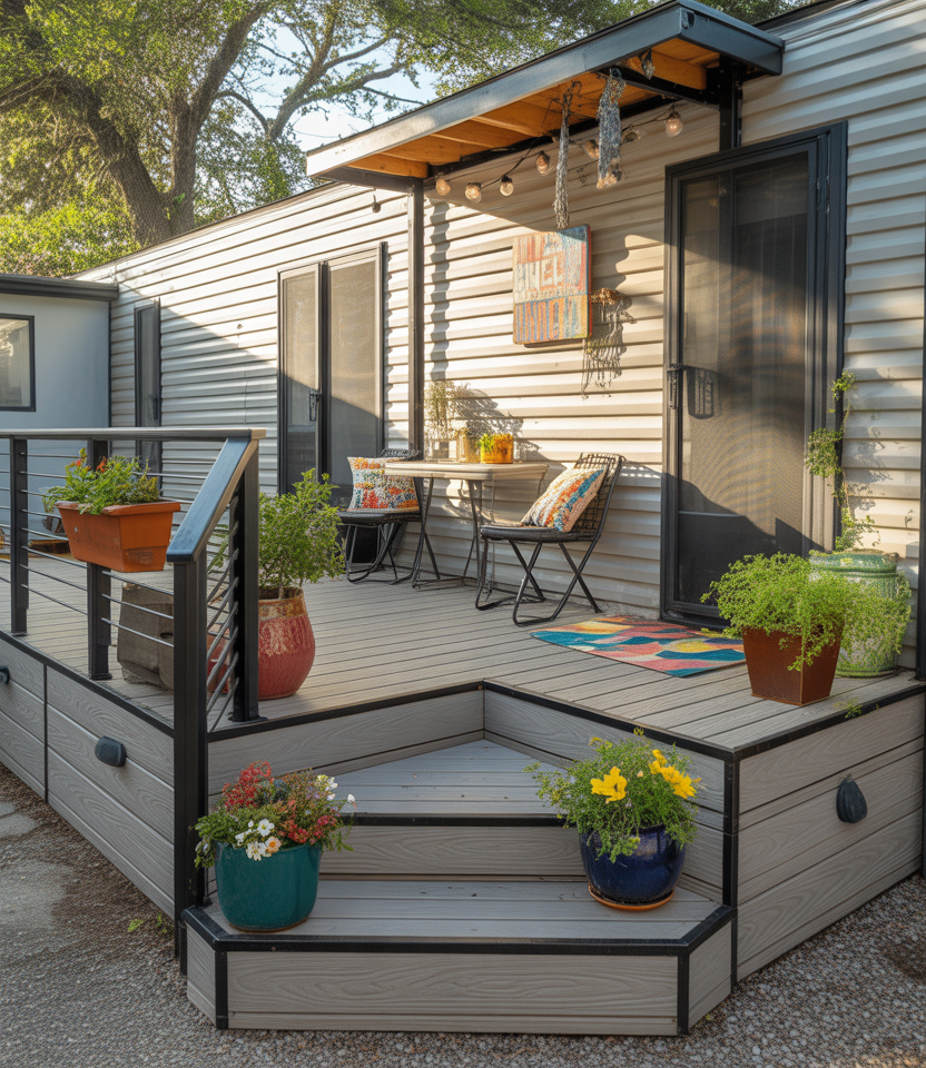 When decorating a mobile home, starting with small elements can create a big visual impact. Add modular decking, bold decor, or handcrafted DIY shelves for potted plants. Lightweight furniture designs, storage, or both open your compact areas for maximum personal style. One planter designer Home Depot recommends will improve your home’s curb appeal.