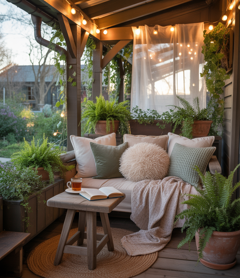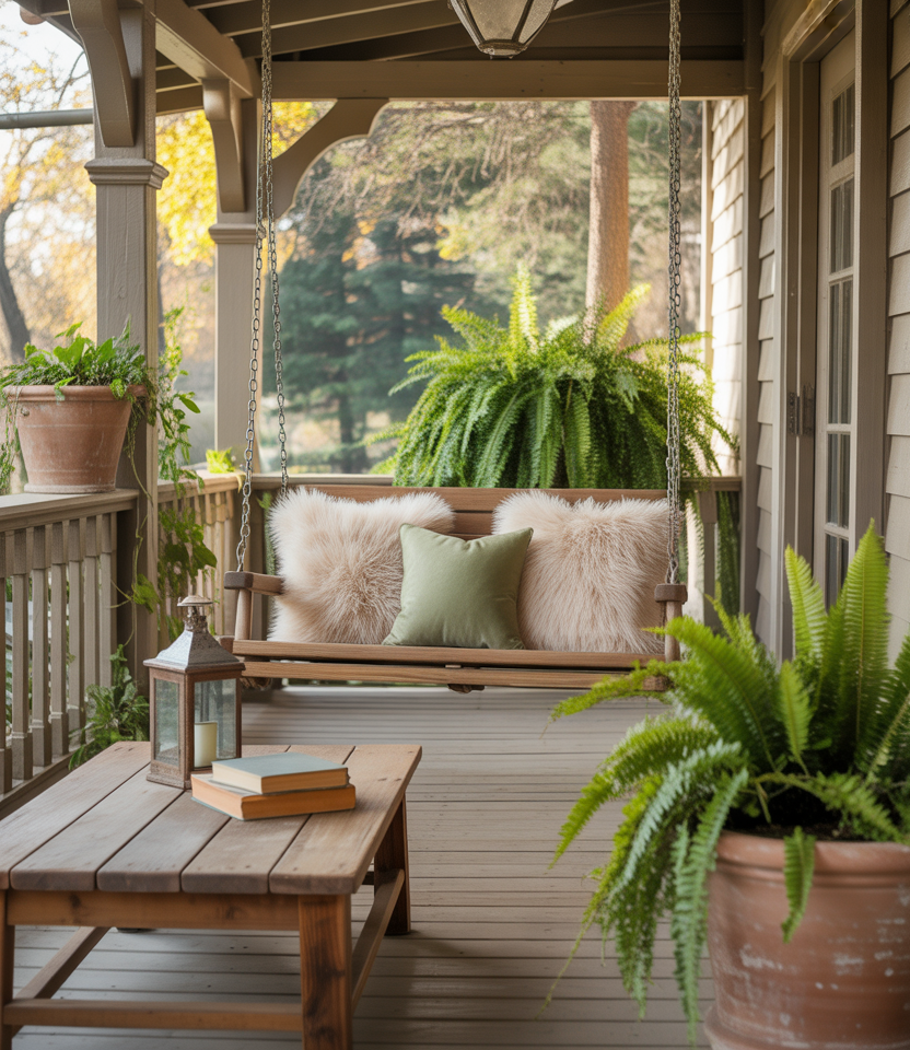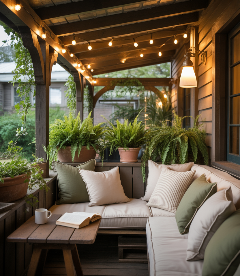 Transform an unused corner of your covered porch into a peaceful reading retreat. Add plush seating, layered cushions, and a side table for coffee or books. Surround the nook with greenery in planters for softness. This intimate sitting space turns any porch into your favorite morning hideaway.