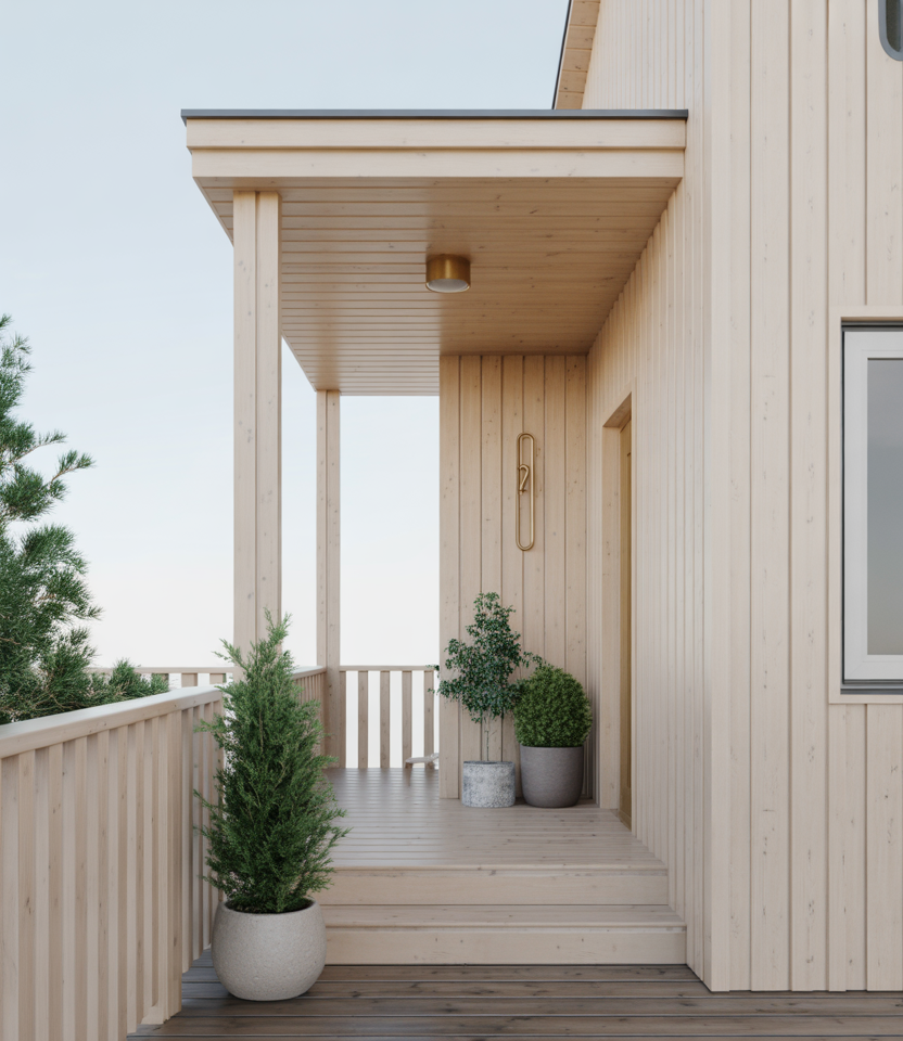 Scandi-style decor continues to dominate 2026—perfect for narrow front porches. Embrace clean lines, pale woods, and neutral tones. Add a single planter with evergreens, woven textures, and natural light to keep the space airy. The result feels minimal, bright, and effortlessly sophisticated.