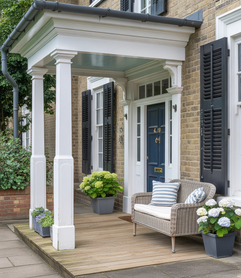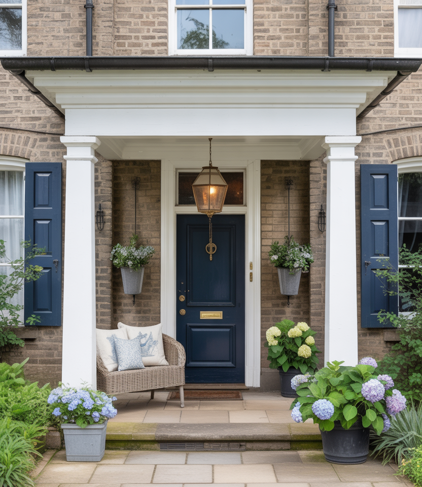 If you live in the UK or just appreciate its timeless charm, lean into classic front-porch styling: a white columned portico and a navy or sage door (2026 trend colors), paired with wicker seating, striped cushions, and potted hydrangeas or lavender. Your decor palette should be crisp, confident, and reflective of outdoor scenery. Results: a laid-back but polished front-door welcome.