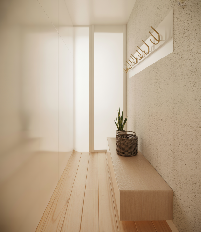 A minimalist Nordic look suits any entrance, especially a long narrow corridor needing calm structure. Light wood, matte whites, and simple hooks make the home feel naturally organized. I once added a narrow bench in a friend’s apartment hallway, and the quiet symmetry instantly balanced the space. This style works beautifully in modern houses, compact condos, and sleek dorm environments.