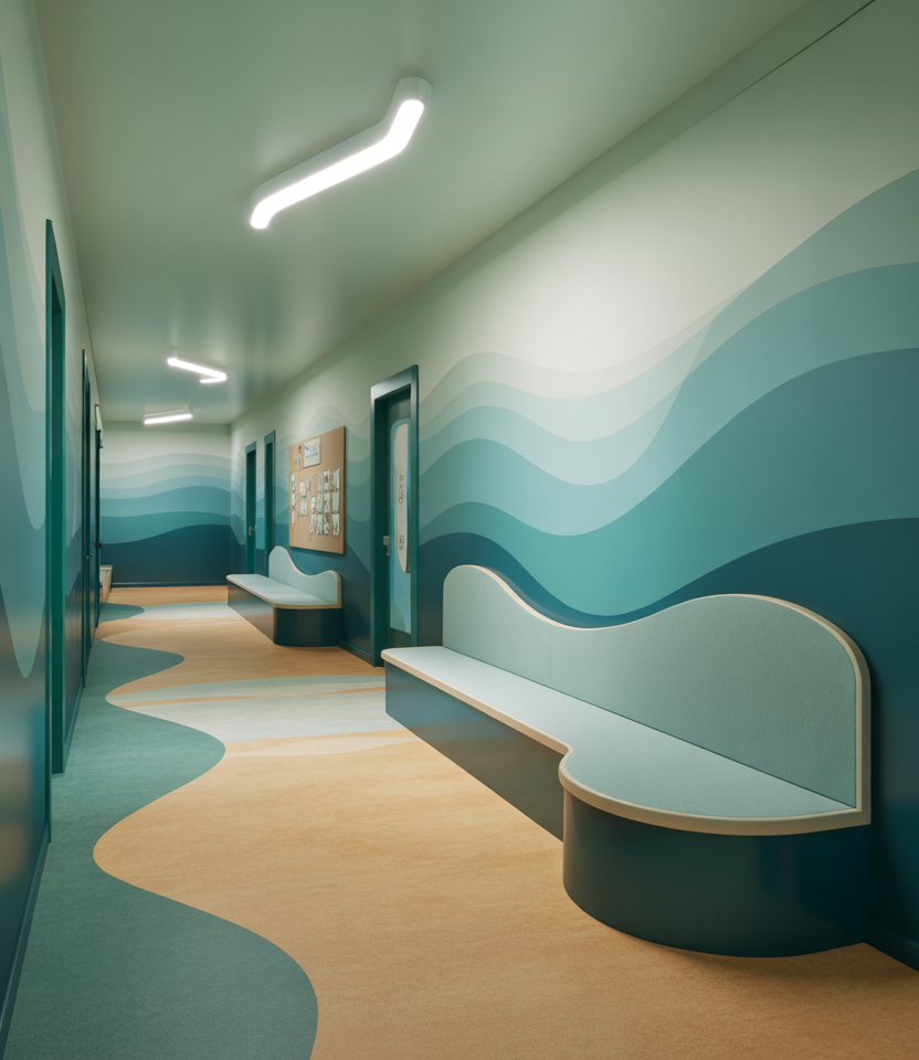 Hallways leading to school or a classroom benefit from soft oceanic inspirations—muted blues, sand shades, and simple wave motifs. Even a narrow corridor feels gentle when reflecting the sea. I once painted a wave silhouette at a community center, and kids said it felt refreshing. Works well in educational buildings or family home learning nooks.