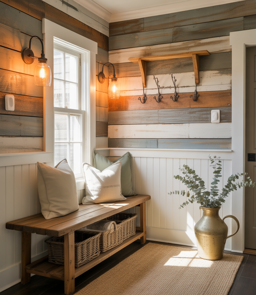 A rustic farmhouse hallway combines reclaimed wood, neutral colors, and cozy textures—perfect for a welcoming entry or upstairs landing. A friend installed a sliding barn-inspired accent in a long corridor, and the charm was instant. This style is equally at home in urban apartments longing for warmth or rural homes celebrating simplicity.