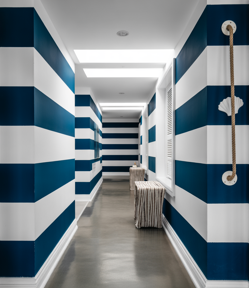 Crisp navy stripes echo the sea and help structure a long hallway visually. This nautical approach works well in entrance spaces, lakeside homes, or even maritime-themed classroom corridors. I once painted horizontal stripes in a friend’s cottage hall, creating a classic rhythm that felt timeless.