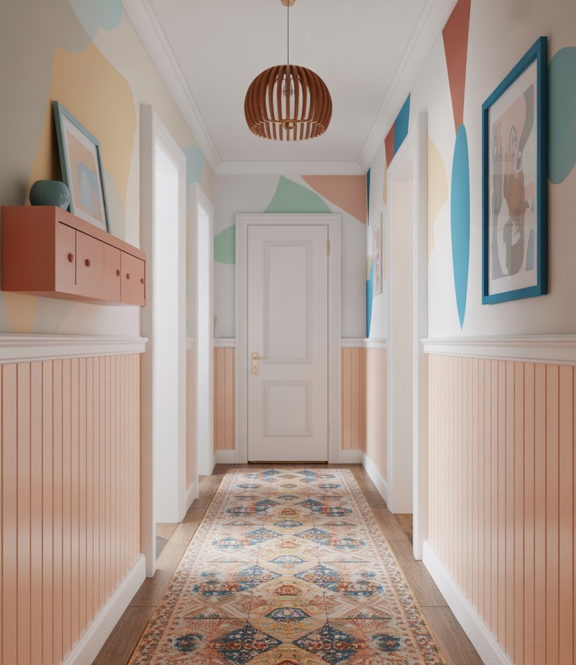 Bold colors define 2026 hallways, especially in modern entry areas where first impressions matter. Color-blocking elevates even long narrow corridors, giving shape and rhythm without overwhelming. I once used a terracotta lower wall and cream upper half in a compact home entrance, instantly adding depth. Works well for apartments, townhouses, and trendy dorm spaces.