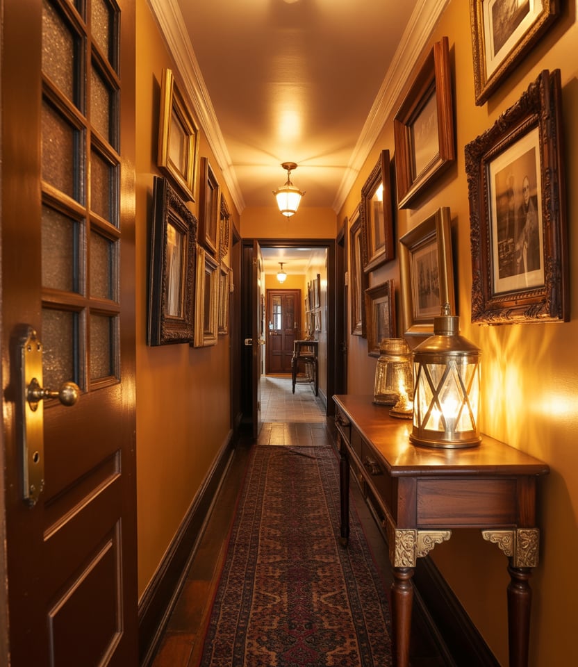 A vintage-inspired hallway lined with antique frames, aged brass, and warm colors can turn a long and narrow space into one that is storied and inviting. Once I helped restore an old bungalow entrance using thrifted art, every visitor paused for a closer look. This style works wonderfully in older home layouts, eclectic apartments, and cozy upstairs transitions.