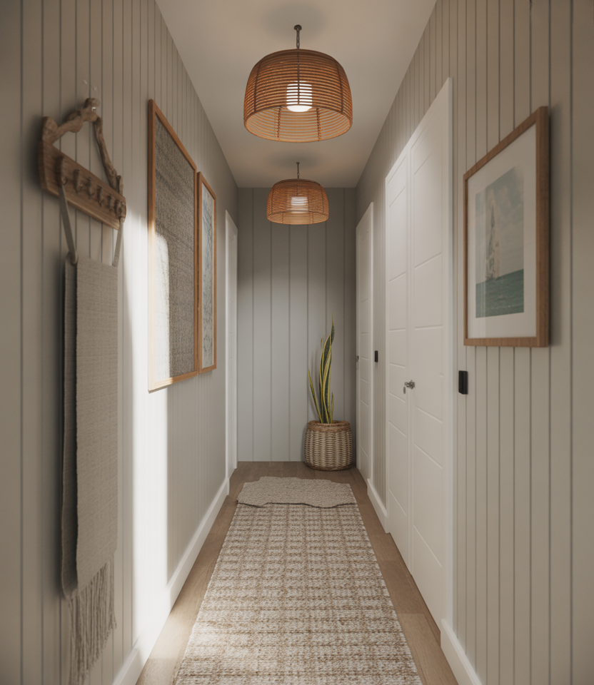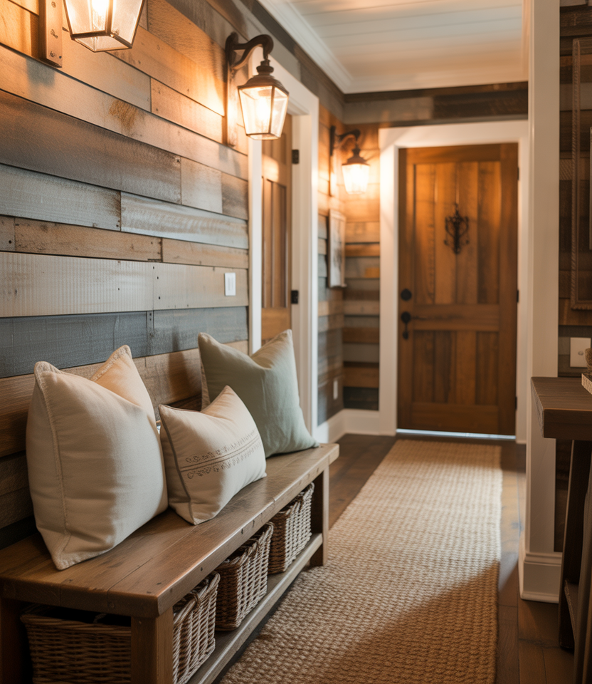 A rustic farmhouse hallway combines reclaimed wood, neutral colors, and cozy textures—perfect for a welcoming entry or upstairs landing. A friend installed a sliding barn-inspired accent in a long corridor, and the charm was instant. This style is equally at home in urban apartments longing for warmth or rural homes celebrating simplicity.