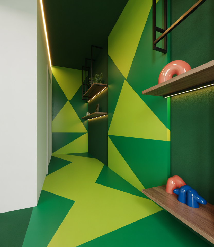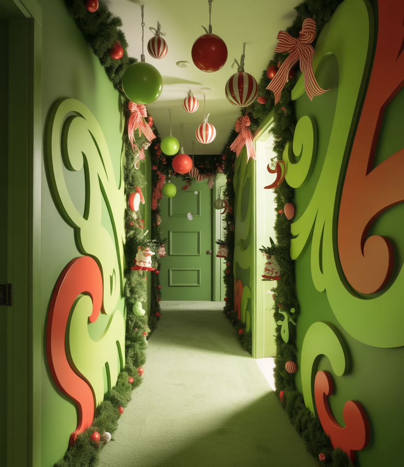 Instead of full theme décor, a subtle Grinch-green accent wall adds playful color to a home or school hallway. Bright green bands or geometric shapes energize a long narrow corridor. I tried a diagonal stripe in a studio hall, and guests instantly smiled. Works year-round for those who enjoy quirky touches.