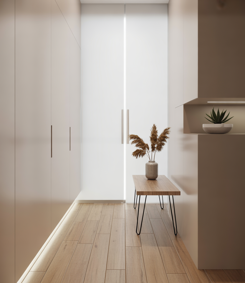 A minimalist Nordic look suits any entrance, especially a long narrow corridor needing calm structure. Light wood, matte whites, and simple hooks make the home feel naturally organized. I once added a narrow bench in a friend’s apartment hallway, and the quiet symmetry instantly balanced the space. This style works beautifully in modern houses, compact condos, and sleek dorm environments.