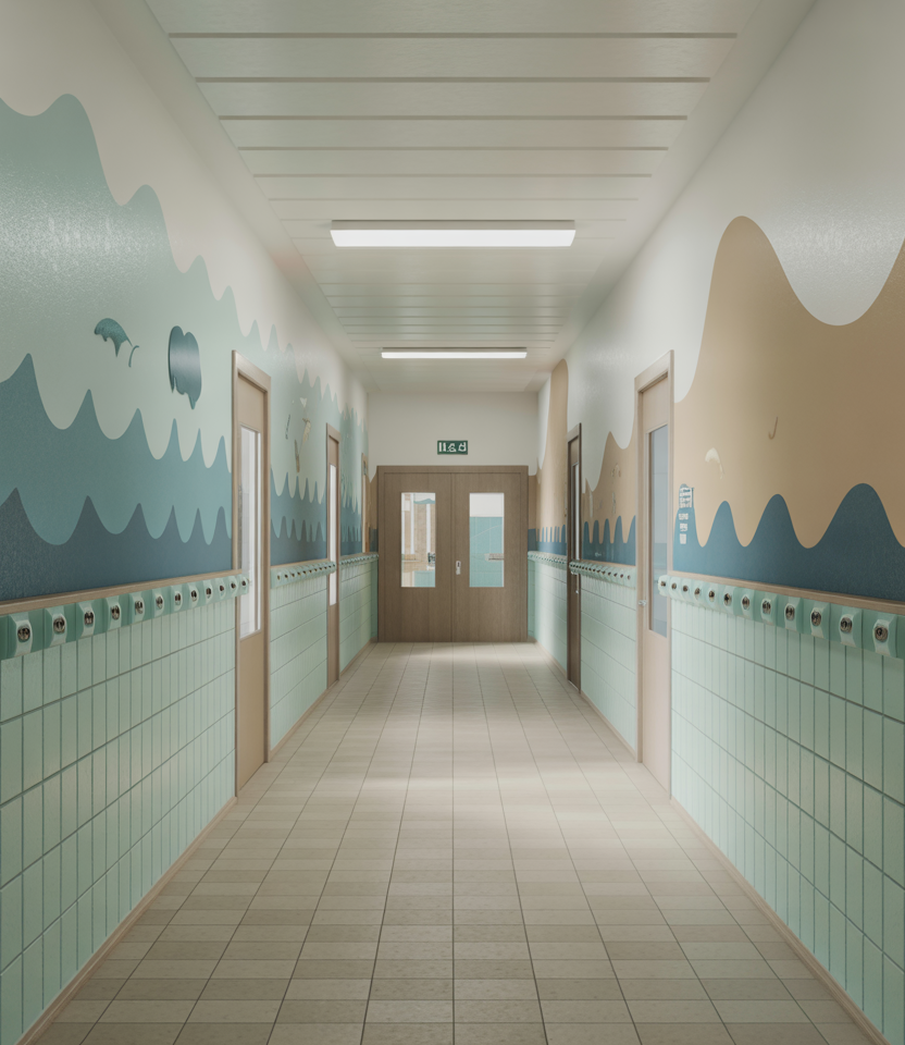 Hallways leading to school or a classroom benefit from soft oceanic inspirations—muted blues, sand shades, and simple wave motifs. Even a narrow corridor feels gentle when reflecting the sea. I once painted a wave silhouette at a community center, and kids said it felt refreshing. Works well in educational buildings or family home learning nooks.