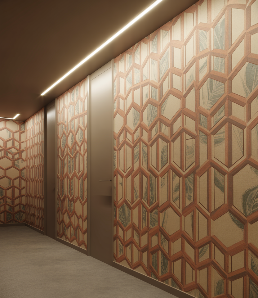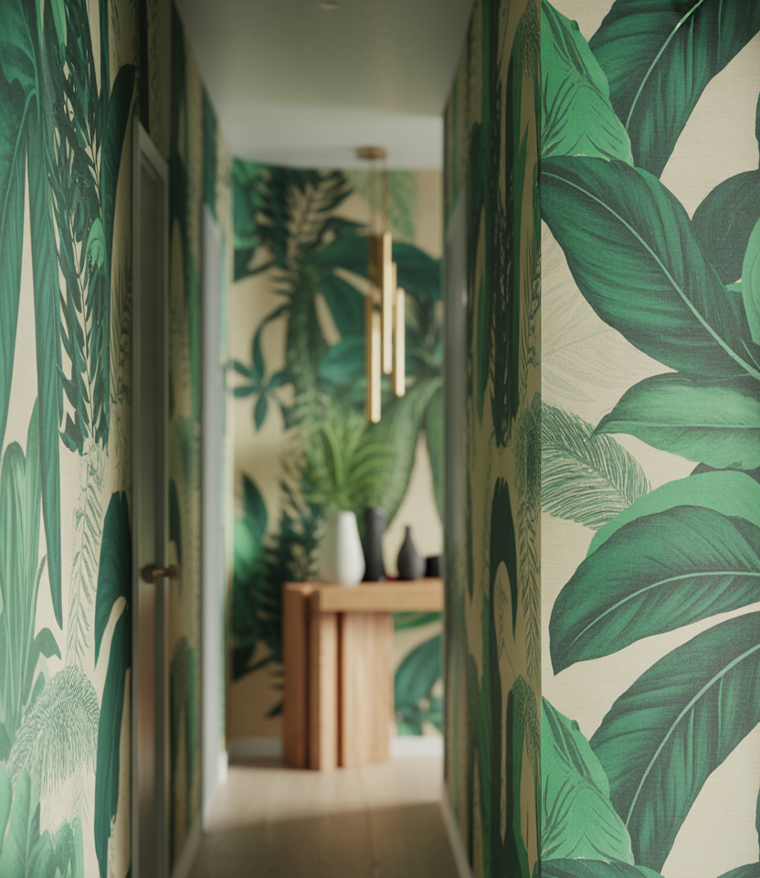 Bold botanical wallpaper brings life to a large hallway or brightens a short connector space. Lush leaf prints make even compact areas feel fresh. I used palm-print wallpaper in a condo entrance, and visitors said it felt like a vacation. Works beautifully with natural light or paired with subtle accent lamps in darker homes.