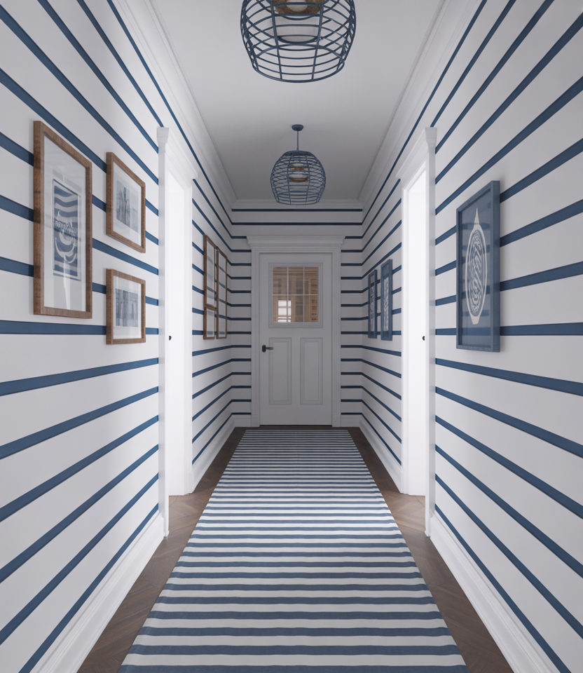 Crisp navy stripes echo the sea and help structure a long hallway visually. This nautical approach works well in entrance spaces, lakeside homes, or even maritime-themed classroom corridors. I once painted horizontal stripes in a friend’s cottage hall, creating a classic rhythm that felt timeless.
