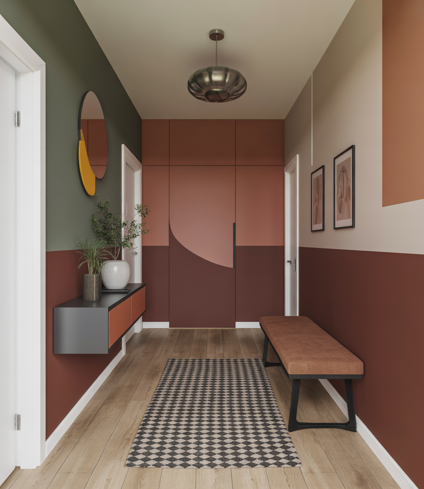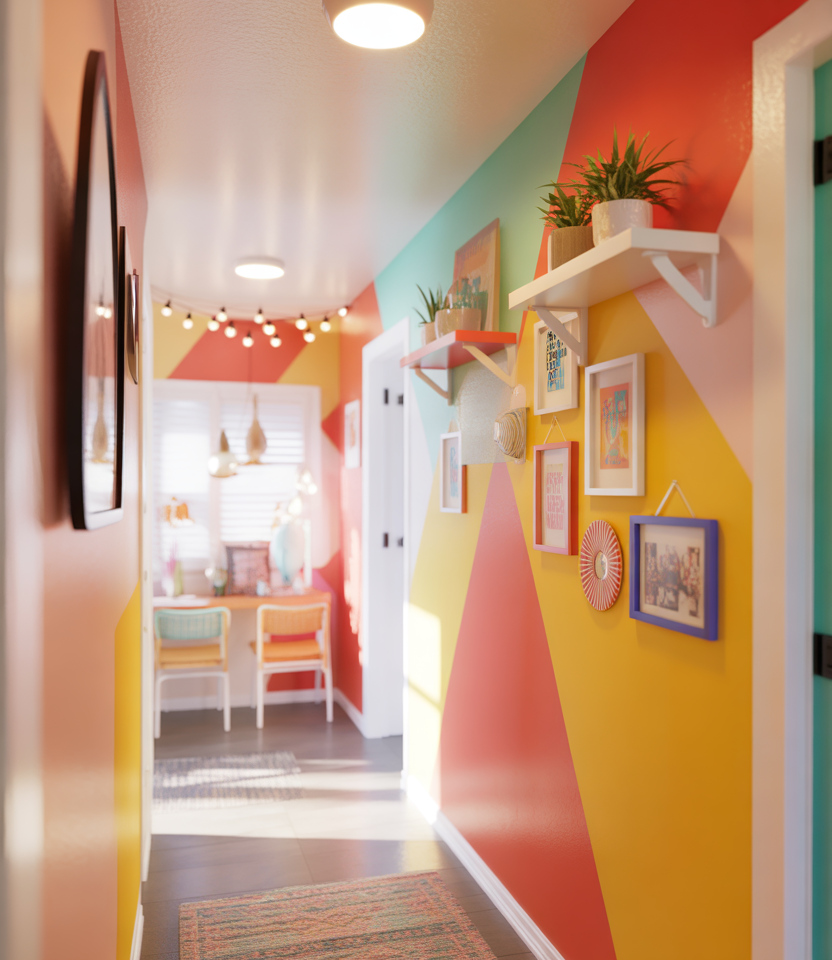 Bold colors define 2026 hallways, especially in modern entry areas where first impressions matter. Color-blocking elevates even long narrow corridors, giving shape and rhythm without overwhelming. I once used a terracotta lower wall and cream upper half in a compact home entrance, instantly adding depth. Works well for apartments, townhouses, and trendy dorm spaces.