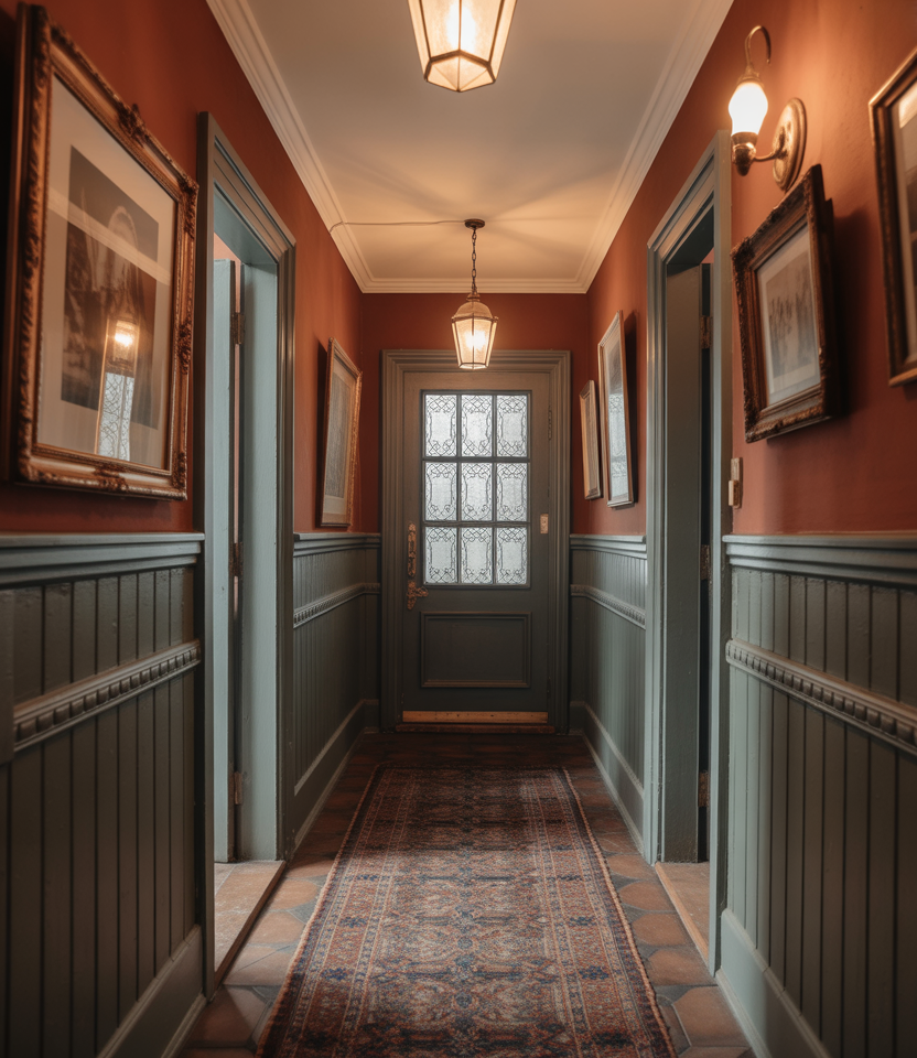 A vintage-inspired hallway lined with antique frames, aged brass, and warm colors can turn a long and narrow space into one that is storied and inviting. Once I helped restore an old bungalow entrance using thrifted art, every visitor paused for a closer look. This style works wonderfully in older home layouts, eclectic apartments, and cozy upstairs transitions.